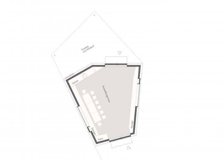 Zwei markante, eingeschossige Gebäude in Holzbauweise, eines zu Ausstellungs- und eines zur Lagerzwecken, definieren zunächst die beiden Eckpunkte des rechteckigen Grundstückes. Zwischen diesen und der Lärmschutzwand spannt sich ein System polygonaler Wege auf, die die bewirtschafteten Felder definieren und zum Spazieren im Weltacker einladen. Die neue polygonale Wegeführung hebt dabei die Wahrnehmung der rasterartigen Parkplatzbepflanzung durch die Platanen auf und lässt Reminiszenzen an einen baumüberstanden Hain aufkommen.