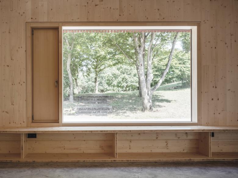 Ein helles Plattenband fasst die beiden Gebäude und die Lärmschutzwand als klar ablesebarer Rahmen, der sich um den Weltacker legt, zusammen und hebt ihn aus seiner Umgebung hervor.