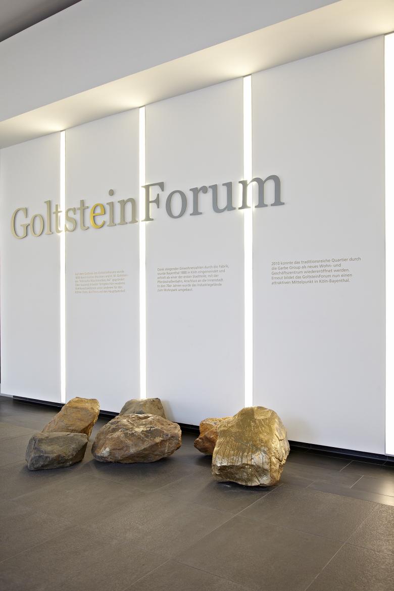 Das Treppenhaus eines Hochhauses und einer Gewerbe-Immobilie sollten aufgewertet werden. Angelehnt an die Historie des Standortes entstand ein Gestaltungskonzept, dass den Genius Loci betont. Inspiriert von der Lage am Rhein, dem „Golt(d)stein“ und der früheren Eisenfabrik, bilden natürliche Farbtöne von Sand bis Dunkelbraun, akzentuiert mit Gold und Silber das durchgehende Farbkonzept.