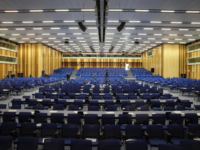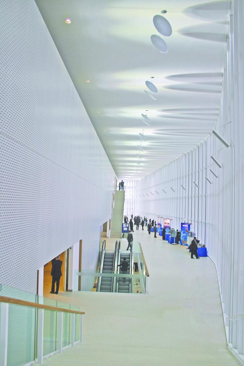 Der wahre Blickfang liegt jedoch im Inneren: mit ablesbaren Rampen, Stiegen und Foyers sowie lichtdurchlässigen Sichtachsen werden die funktionell erforderlichen Anbindungen an das Herzstück, die Konferenzräume, verdeutlicht. Die Grundkonzeption wird von der Prämisse des Sichtbarmachens der Bewegungsflüsse bestimmt: Ein kompakter Kern, die klare Trennung des Verwaltungs- und Konferenzbetriebes sowie die Übersichtlichkeit der Foyerzonen garantieren maximale Orientierung und reibungslose Abläufe.