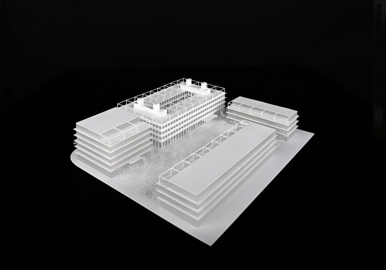 Der Campus besteht aus vier individuellen Baukörpern, die einen zentralen und in alle Richtungen offenen Platz formen. Bäume wechseln sich hier mit Rasenflächen und unversiegelten befestigten Bereichen ab. Angrenzende Parks setzten sich in die Mitte fort und schaffen einen urbanen Ort mit grüner Note, zu dem sich auch alle Gebäudeeingänge orientieren. Auf diese Weise bleiben die direkten Vorbereiche der Bürohäuser frei für einladende Eingangszonen und belebende Gastronomieangebote. Zur Gorxheimer Straße hin präsentiert sich der Stadt eine aus allen Richtungen gut wahrnehmbare moderne Arbeitswelt. Die zulässige Höhe dieses Bauteiles wird nicht ausgenutzt, wodurch ein weitläufiger Dachgarten mit intensiv begrünter Pergola und Photovoltaikanlage entstehen kann.
