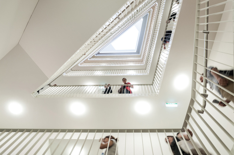 Der gesamte, öffentlich zugängliche Innenhof des Ensembles wurde um ein Geschoß angehoben und als Wald bepflanzt. Diese Grünfläche verbindet die fünf Häuser und ist auch barrierefrei über Rampen erreichbar. Beschattete Bänke, lauschige Plätze inmitten des städtischen Treibens steigern die Lebensqualität und sorgen wiederum für den Austausch der AnrainerInnen.