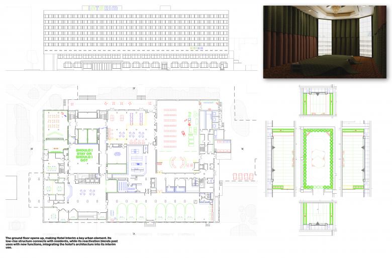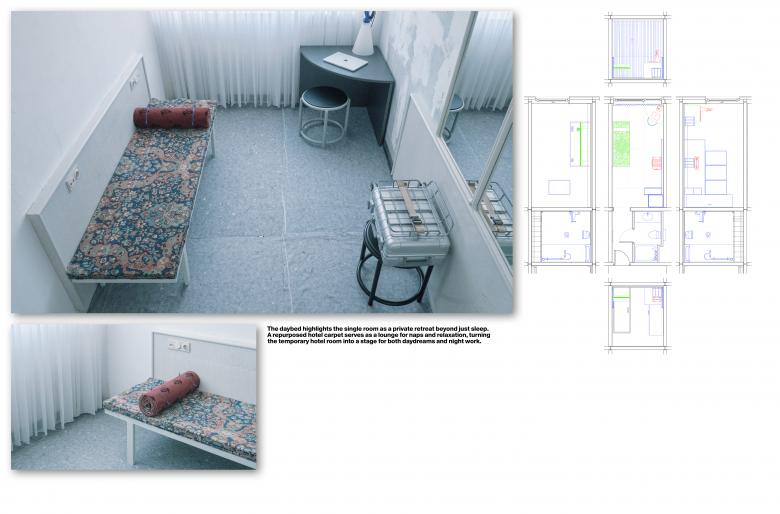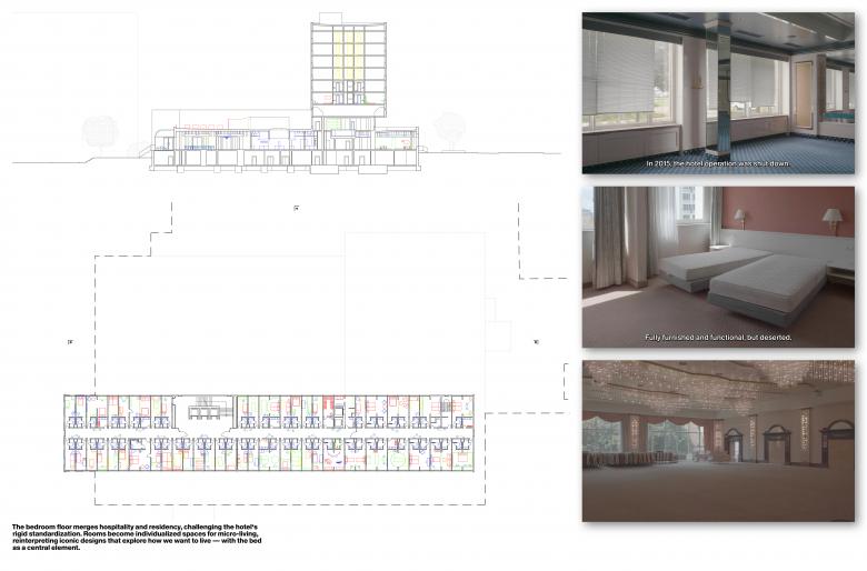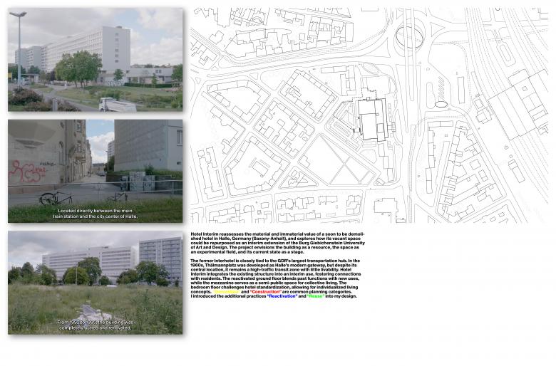 What will be lost if the former Interhotel is demolished? Can waiting be an active state? How can the waking dream become a tangible encounter? Rising costs prevent both the hotel's demolition and the university’s long-anticipated studio expansion. This presents an opportunity: Instead of demolition, could repurposing offer a solution? Hotel Interim explores how adaptive reuse can mediate between conflicting interests, rethinking architecture’s role in uncertain times — perhaps even as a way to prevent the building’s disappearance.