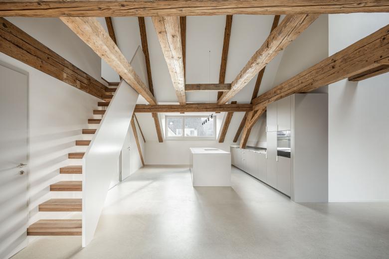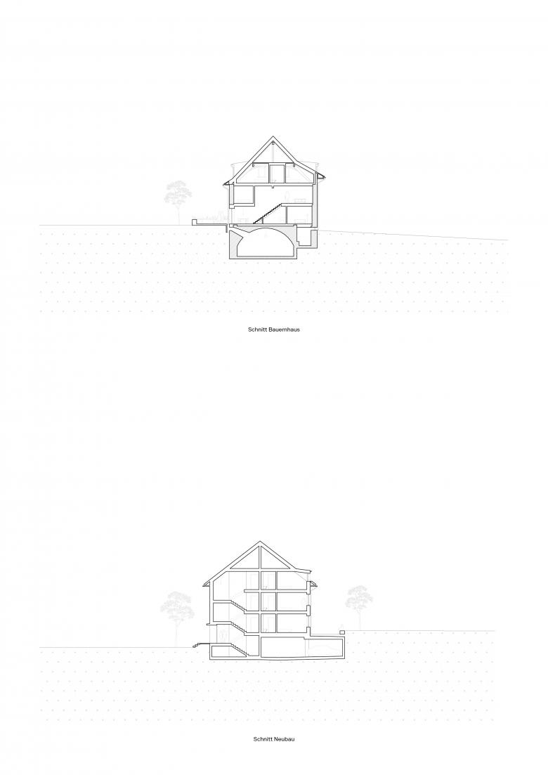 Über einen Verbindungsgang im Untergeschoss werden die beiden Baukörper miteinander verbunden. Die Parkgarage wird von beiden Häusern gemeinsam genutzt. Durch die exzentrisch gesetzten Erschliessungskerne entsteht ein diverser Wohnungsmix: 2.5-, 3-, sowie 3.5-Zimmer-Wohnungen. Alle Wohnungen sind barrierefrei erschlossen. Das Bauernhaus wird hinsichtlich verdichteter Bauweise von einer Wohneinheit in neu 4 Wohnungen transformiert. Der Erschliessungsturm mit Balkonflächen dockt als filigrane Stahlkonstruktion an die nördliche Fassade an und spielt gegenüber dem Bestand zusätzliche Wohnfläche frei.