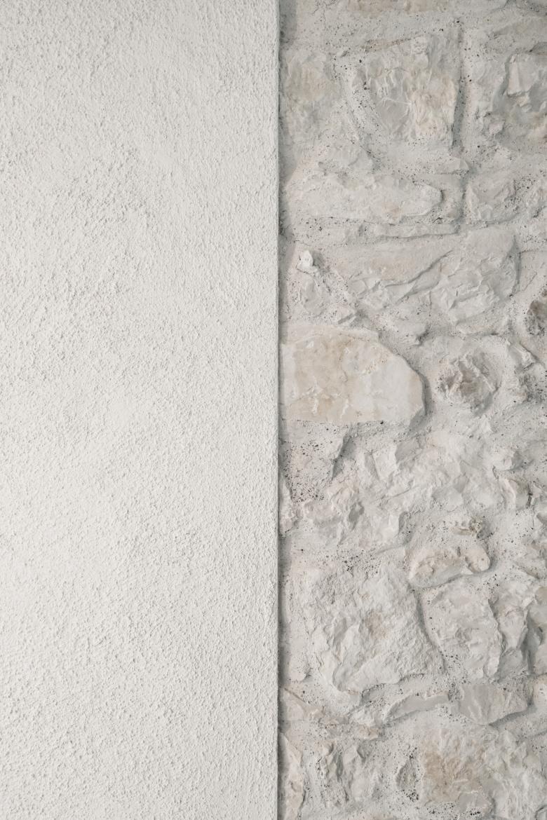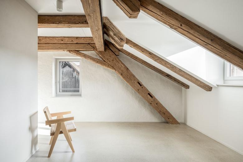 Die Materialwahl wurde kontextbezogen ausgewählt und abgestimmt. Der leicht weiss eingefärbte Anhydritestrich sowie die hellen Oberflächen der Wände und Decken nehmen sich zurück und passen stimmig zu den holzigen Oberflächen der Fenster und Türen sowie der Balken und Bruchsteinwände. Die Verwendung von regionalen und naturbelassenen Materialien entspricht ganz der gewünschten Philosophie und ermöglicht gleichzeitig ein natürliches Klima, welches atmet und entsprechend die Raum- und Luftqualität positiv prägt und aktiv beeinflusst.