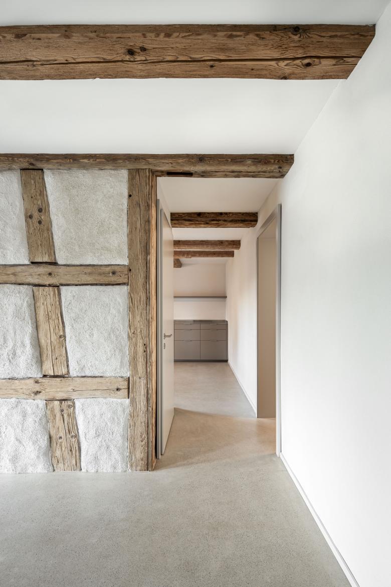 Im Bestand bleibt viel belassen und erhalten. Es entsteht ein besonderer Ausdruck, die Geschichte des Hauses bleibt ablesbar. Der Dachstuhl, die alten Deckenbalken, Fachwerkwände und Bruchsteinwände sind frei gelegt und aufbereitet. Die übrigen Wände erhalten innen einen neuen mineralischem Dämmputz. Das Dach ist aufgedämmt, alle Fenster mit neue Holzfenstern ersetzt. Der Neubau ist als monolithischer Massivbau konzipiert. Das Einsteinmauerwerk wurde innen als auch aussen mit einem mineralischem Kalk-Putz verputzt. Die Dachkonstruktion aus Holz wird mit Tonziegel bedeckt.