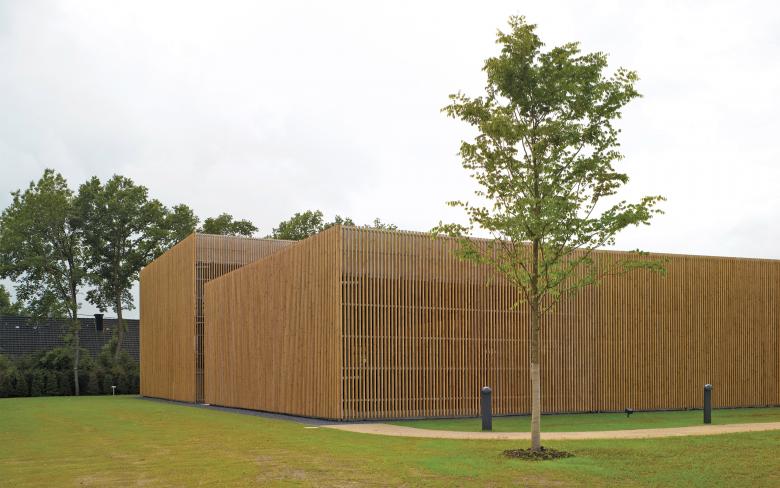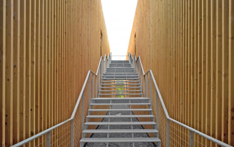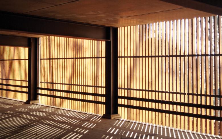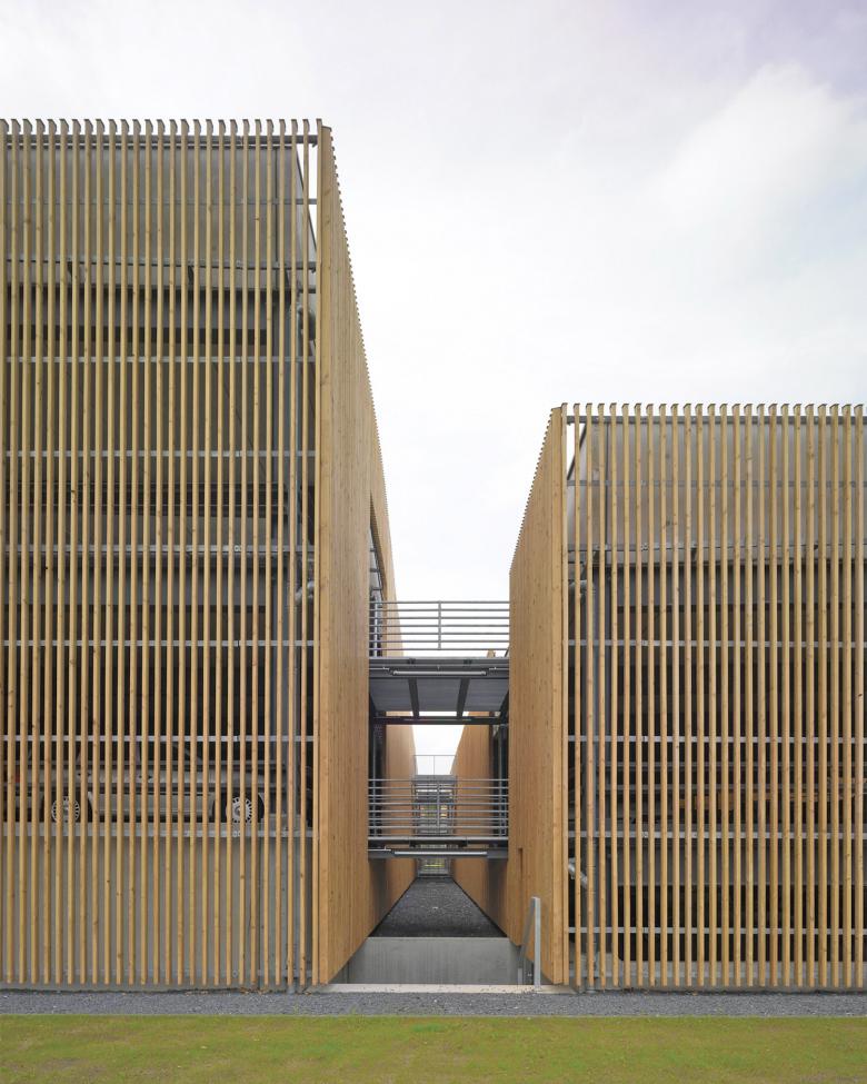 Das System der doppelgängigen Parkrampen bietet eine optimale Flächenausnutzung. Die Überwindung der Geschosshöhen erfolgt auf 3.2 % geneigten Parkstraßen. Dadurch werden keine zusätzlichen Auf- und Abfahrtselemente wie etwa Spindeln oder Rampen benötigt. Die Neigung der Parkrampen ergibt sich aus der Baukörperlänge von 127 Meter und der für ein Parkhaus großzügigen Geschosshöhe von 3.06 Meter. Die im Schnitt x-förmig angeordneten Rampen ermöglichen getrennte Zu- und Abfahrten und sorgen außerdem für den schnellen Abfluss der geparkten Autos, durch die Möglichkeit des Rampenwechsels an den Kreuzungspunkten. Eine Holzfassade verleiht dem Parkhaus seine natürliche Erscheinung und von innen wie von außen einen freundlichen sowie hellen Charakter. Die „Gartenzaun-Fassade“ ist der ideale Vermittler zwischen dem Wohngebiet auf der einen und dem Industriegebiet auf der anderen Seite. Die äußere Hülle erscheint je nach Blinkwinkel transparent oder geschlossen, verbergend oder preisgebend; sie stärkt den monolithischen Charakter der sich verschränkenden Baukörper, ermöglicht aber gleichzeitig eine natürliche Belichtung und Belüftung.