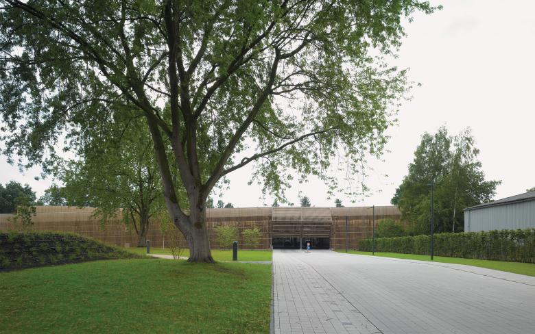 An der westlichen Grenze des Firmengrundstückes, mit Abstand zum Vertriebs-Center haben wir das neue, in zwei gleich große Teile gegliederte Parkhaus mit insgesamt 500 Stellplätzen für die Mitarbeiterinnen von Ernsting's family platziert. Das Ensemble bestehender Firmengebäude wird durch das neue, lineare Bauwerk vollendet, es schließt den Campus zum benachbarten Wohngebiet hin ab. Die Form des zweiteiligen Baukörpers ergibt sich durch ein System von doppelgängigen Parkrampen. Die beiden identischen, spiegelsymmetrischen Gebäudeteile ergänzen sich im Inneren zu einer Kreisfahrt, außen verschränken sich die Körper zur Gesamtfigur. Die gewonnene Freifläche zwischen Vertriebs-Center und dem Parkhaus wird mit Graskissen und Bäumen gestaltet und in den Firmencampus integriert.