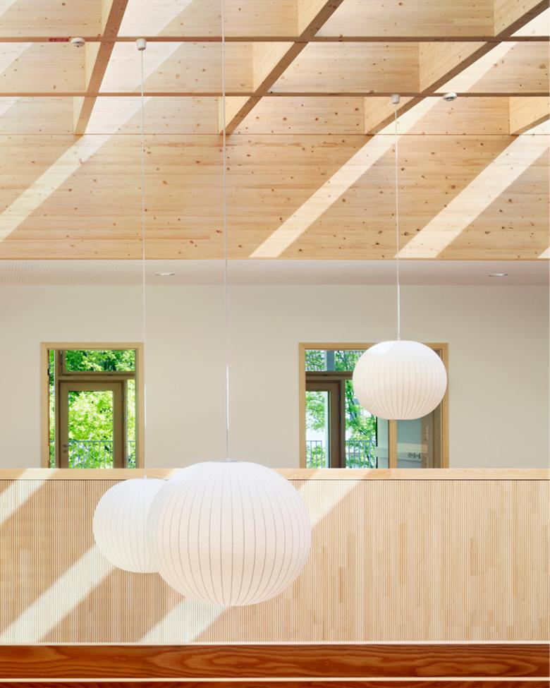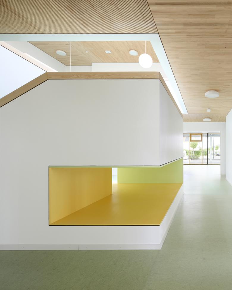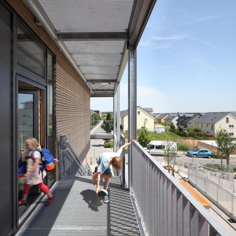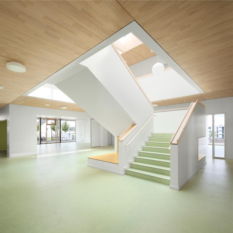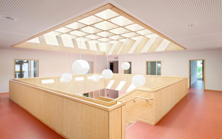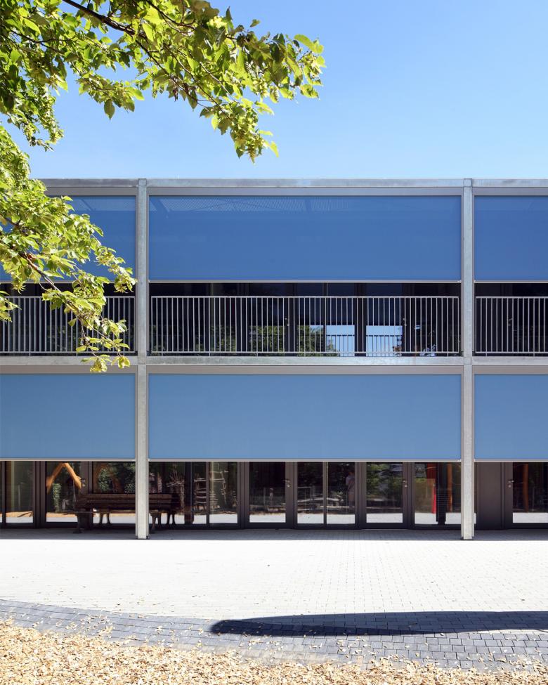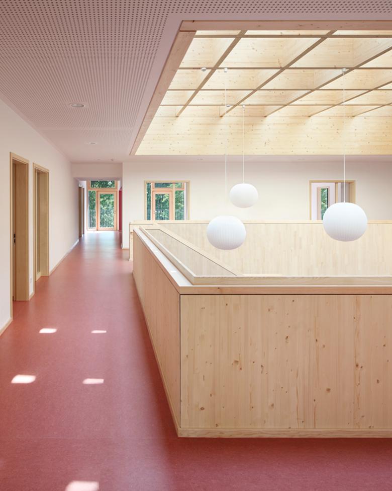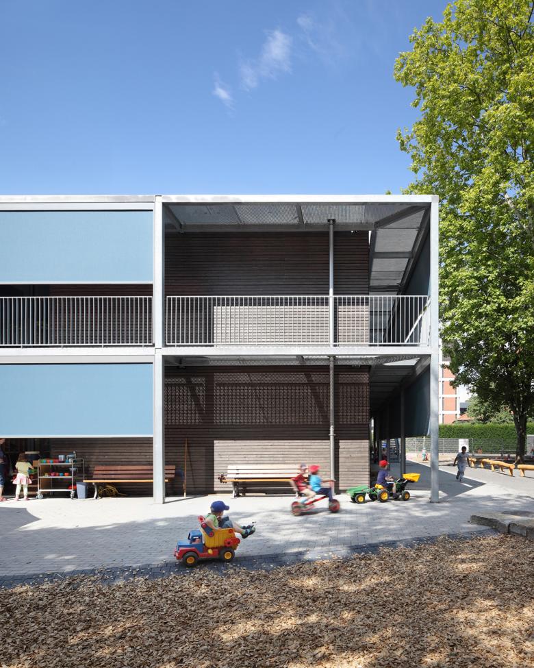 Die Einrichtungen bieten Platz zur Entfaltung für jeweils 100 bis 120 Kinder im Alter von 0 bis 14 Jahren. Der zentrale „Dorfplatz“ ist dabei Dreh- und Angelpunkt aller Aktivitäten im Haus. Seine hohe Aufenthaltsqualität als Außen- im Innenraum erhält der Dorfplatz dabei durch sein ausgewogenes Raumvolumen sowie die schwebende Dachverglasung. Der Wechsel von Tages- und Jahreszeiten ist spürbar, der Trägerrost aus Brettschichtholz filtert das einfallende Licht und bestimmt die Atmosphäre in angenehmer Weise. Um den Dorfplatz gruppieren sich über zwei Geschosse windmühlenartig acht „Bausteine“, in denen die Gruppenräume wie auch die weiteren Nutzflächen untergebracht sind. Die vorgesetzte Stahlloggia dient als Übergangsraum zwischen innen und außen, in der Stützenebene ist der weitgespannte, textile Sonnenschutz angeordnet. Ganz nebenbei lassen sich mit der umlaufenden Loggia alle erhöhten Anforderungen an die Rettungswege erfüllen.