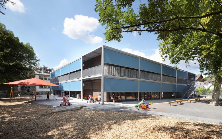 Auf Grundlage eines gewonnenen Wettbewerbs wurde für die Stadt Frankfurt am Main ein Baukastensystem für Kindertagesstätten in Passivhausbauweise entwickelt, das an insgesamt fünf verschiedenen Standorten, in Riedberg, Harheim, Fechenheim, Eckenheim-Nord und Sachsenhausen, realisiert worden ist. Die zweigeschossigen Gebäude sind konsequent als konstruktiver Holzbau auf einem Raster von 62.5 Zentimeter geplant und umgesetzt worden. Die vielfachen Vorzüge des Holzbaus kamen bei der Projektreihe in besonderem Maße zum Tragen.