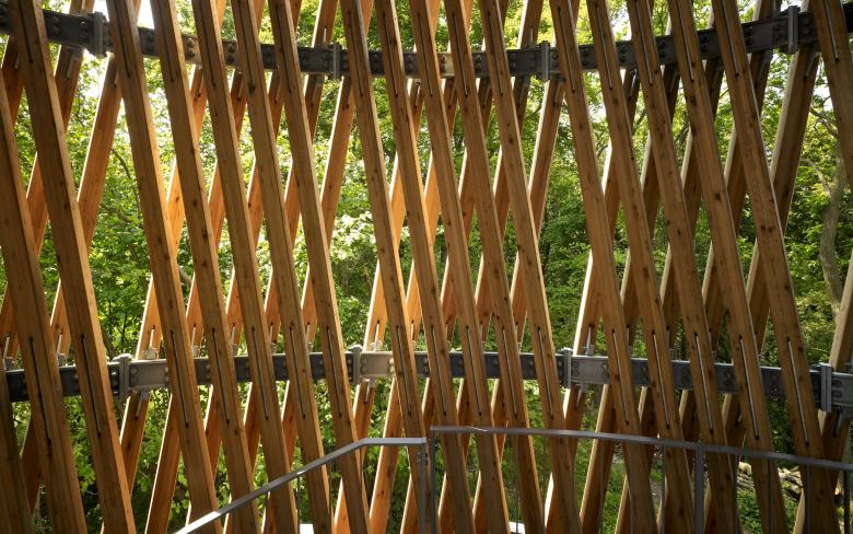 Das vereinfachte Statische Modell des Turms ist eine eingespannte Röhre, deren maximale Belastung infolge der horizontalen Windkräfte an der Einspannstelle entsteht. Die Konstruktion ist über Stahlnadeln bis zu sechs Meter tief in den Felsuntergrund verankert. Oberhalb des Fundaments wird mit abnehmender Anzahl der Holzstäbe auch die Steifigkeit des Turms nach oben hin immer weiter reduziert. Entsprechend der abnehmenden Lasten weitet sich die Netzstruktur nach oben hin. Die Stäbe in der untersten Ebene bestehen aus sechs Einzelstäben, von denen im nächsten Abschnitt fünf weitergeführt werden, anschließend vier, drei und schließlich zwei Stäbe. Dadurch wird auf dem Weg nach oben stufenweise mehr Aussicht in die Landschaft freigegeben und es entsteht auf den fünf Podesten durch das abnehmende Stabwerk jeweils eine eigene individuelle Atmosphäre.