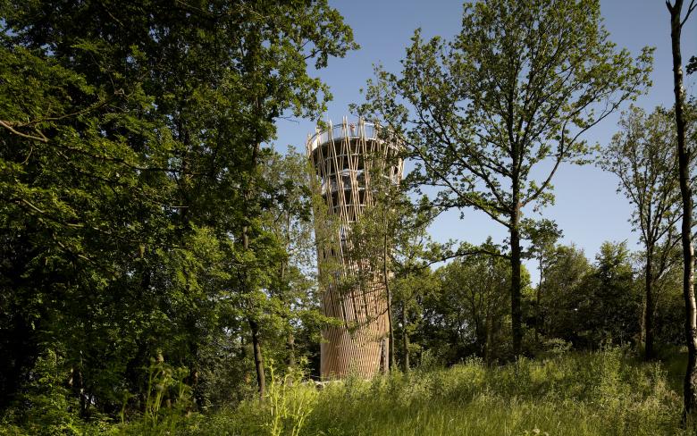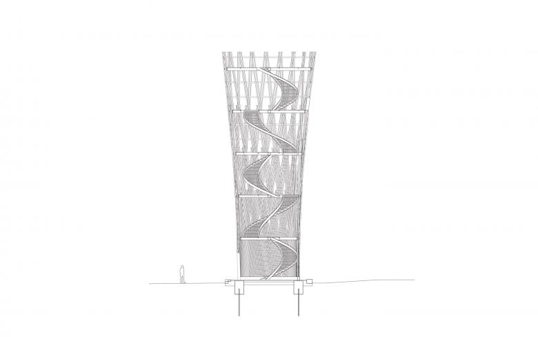 Der Aussichtsturm am Jüberg, weit sichtbar am Ende einer langen Treppen prominent positioniert, markiert den Endpunkt der Stadt und den Übergang in die Landschaft. Die sich nach oben weitende Form des Turms reagiert unmittelbar auf die örtlichen Begebenheiten mit bewaldetem Jüberg, städtebaulicher Achse und 360 Grad Rundumsicht. Die Konstruktion des Bauwerks basiert auf dem Prinzip des Hyperboloids, das von Ingenieur Vladimir G. Suchov (1853 – 1939) vielfach für Stahlkonstruktionen angewendet wurde. Sie besteht aus einem Stabwerk aus Brettschichtholz (BSH) Lärche mit insgesamt 240 geraden Hölzern mit einem Querschnitt von 8 x 8 Zentimeter. Durch Schrägstellen zwei gegenläufiger Stabebenen entsteht eine großmaschige Netzstruktur. Auf weitere vertikale Elemente wie beispielsweise Stahlstützen oder aber einen zentralen Mast wurde konsequent verzichtet.