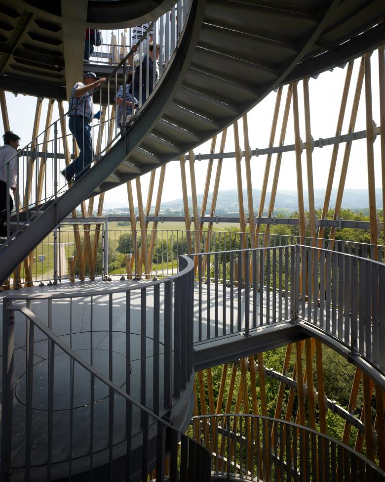 Der Fuß des Turms ist mit rund sechs Metern entsprechend der Schneise im Wald schlank gehalten. Im Inneren der Struktur führen fünf gewendelte Treppenläufe aus Stahl mit insgesamt 125 Stufen auf die Aussichtsplattform in 23.5 Meter Höhe mit einem Durchmesser von neun Metern. Von dort bietet sich ein eindrucksvoller Ausblick über das Sauerland.