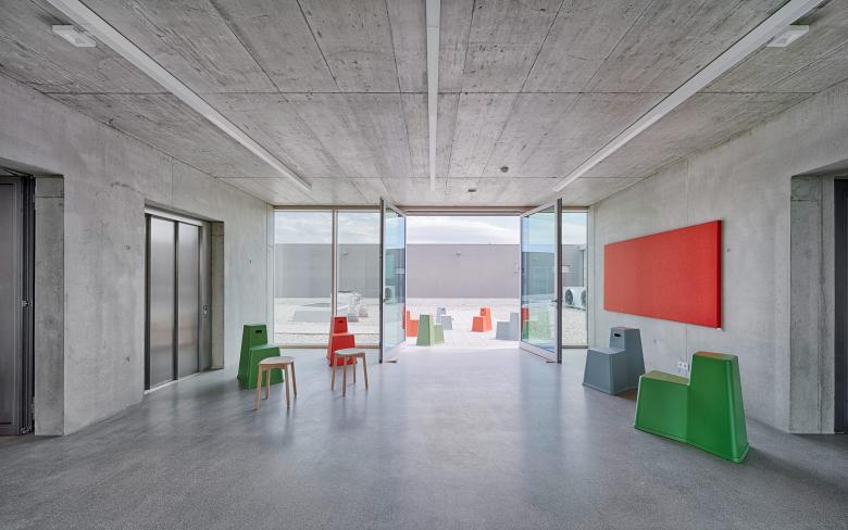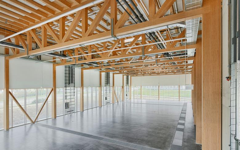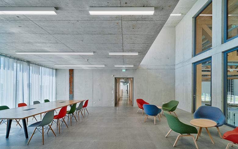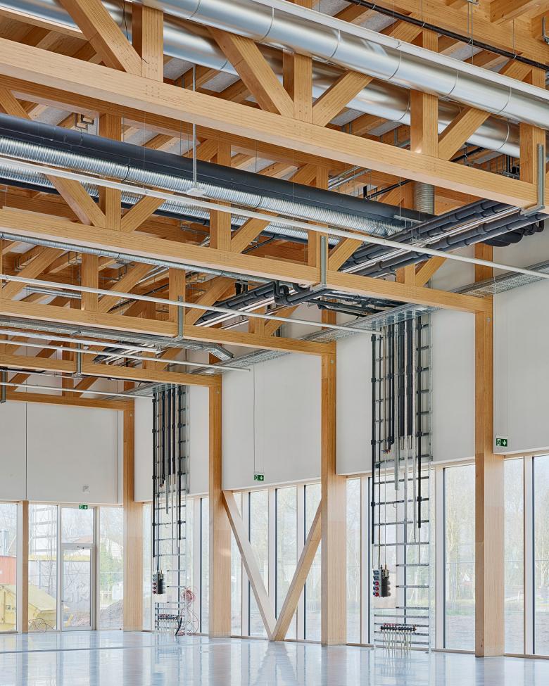 Das Tragwerk des Technikums bilden Stützen und Fachwerkträger aus heimischer Buche, die Spannweite beträgt rund 18 m. Der ergänzende Bürotrakt ist als Stahlbetonskelettbau ausgebildet, die massiven Kerne steifen beide Gebäudeteile aus. Für die Fassade erschien Holz als konsequente Fortführung des Materialkanons und somit als sinnfällige Lösung. Die Außenwände besitzen Passivhausqualität, sie sind als Holzrahmenbaukonstruktion ausgeführt, bekleidet mit grau lasierten Kanthölzern aus Weißtanne.