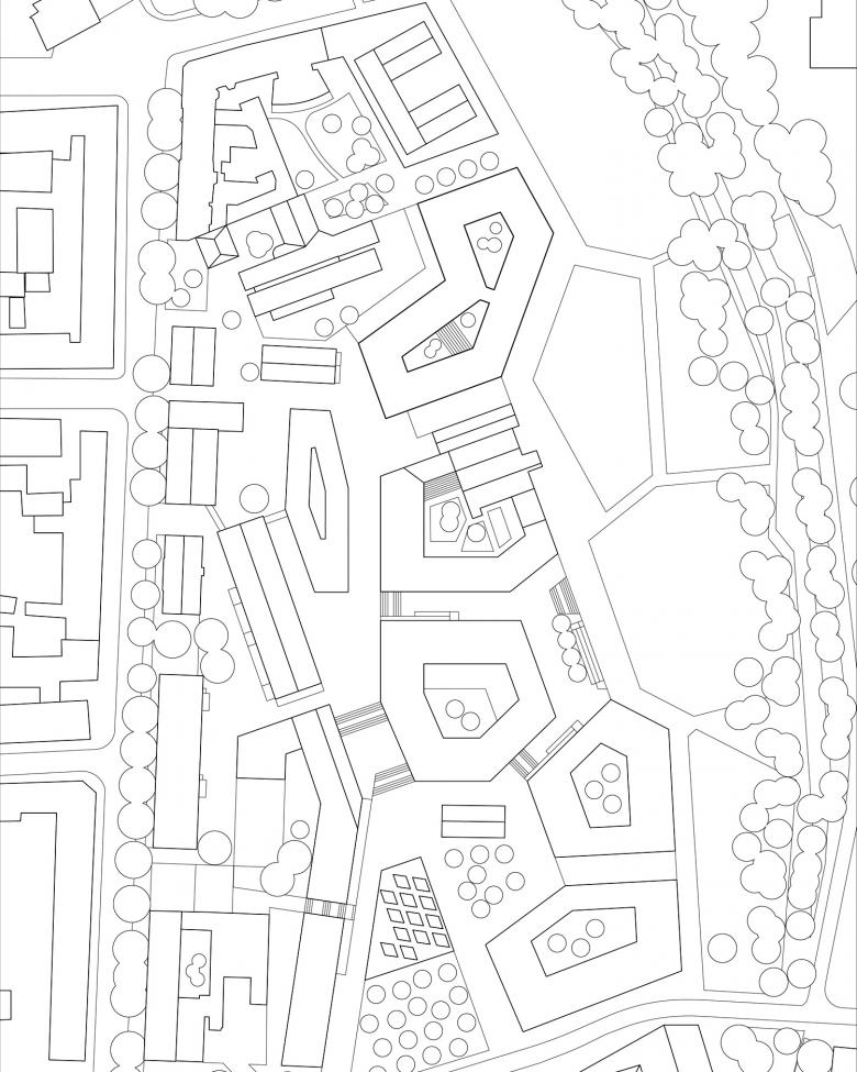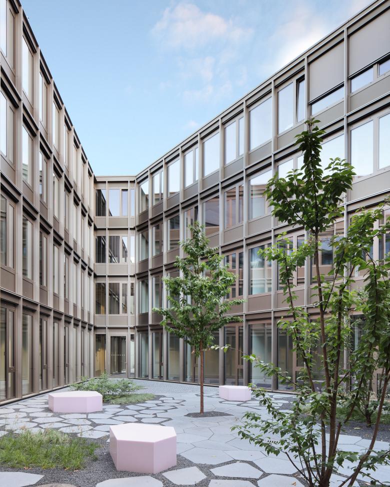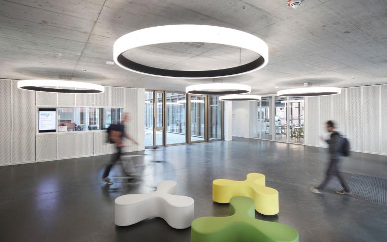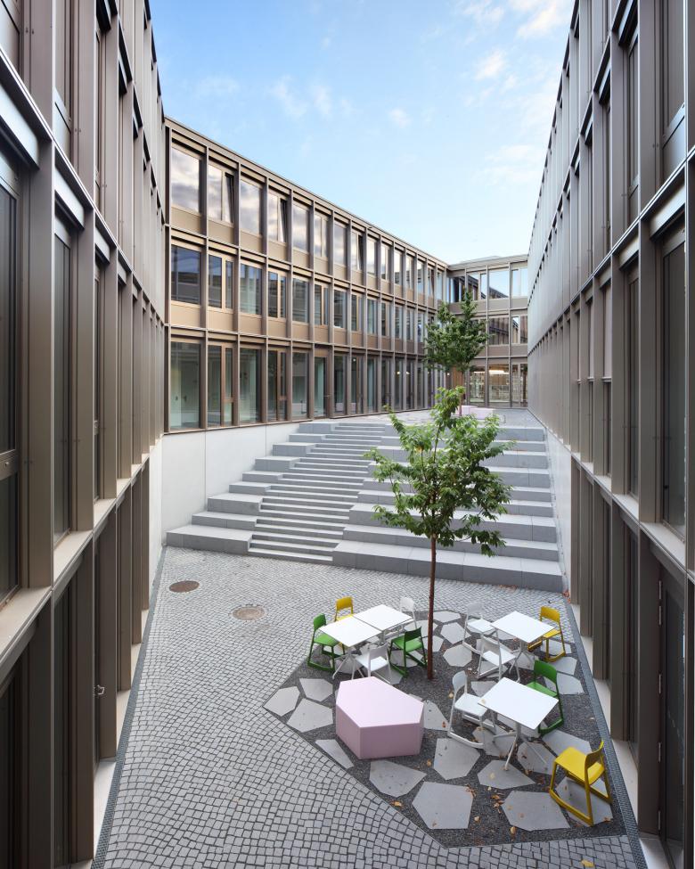 Die im Masterplan für den Campus Nord definierte Grundform des Gebäudes erinnert mit sieben Ecken und zwei Innenhöfen an eine Brezel. Der Neubau vermittelt geschickt zwischen der Höhendifferenz des Campusplateaus und dem Parkniveau an der Ahne. Der Versatz von einem Geschoss ist im südwestlichen Innenhof durch eine Freitreppe erlebbar, die ein zusätzliches Raumangebot für Veranstaltungen und Kurse im Freien bietet. Dieser „öffentliche“ Hof liegt in direkter räumlicher Nähe zu Foyer, Cafeteria und Konferenzbereich. Der nördliche Innenhof erlaubt eine natürliche Belichtung und Belüftung bis in das Sockelgeschoss; die angrenzenden Werkstätten und technischen Büros lassen sich im Sommer in den Hof erweitern. Der Zugang zum Science Park erfolgt im Südwesten - dem Uni-Campus zugewandt - deutlich artikuliert durch einen Einschnitt im Erdgeschoss. Alle zentralen Einrichtungen des Gründerzentrums sind vom Foyer aus auf kurzem Weg erreichbar. Vier lichtdurchflutete Erschließungskerne mit Ausblick in die Umgebung vernetzen das Gebäude in vertikaler Richtung. Über einen Rundgang werden alle Büros horizontal erschlossen. Auf jedem Geschoss bieten großzügige und helle Kommunikationszonen Platz für informelle Treffen und Pausen.