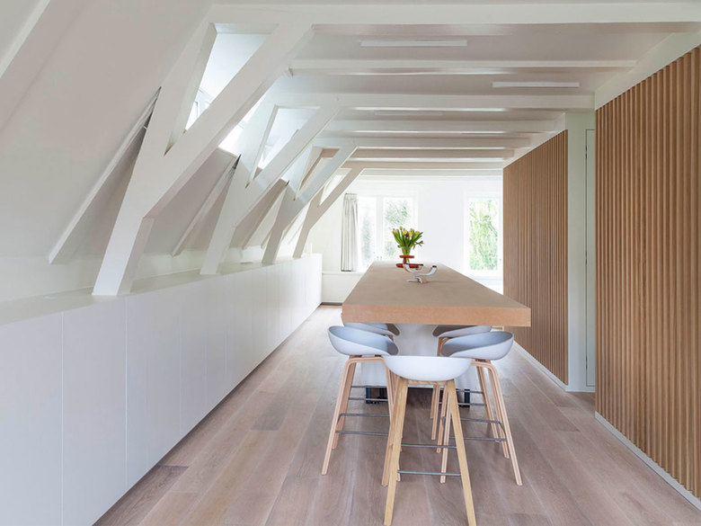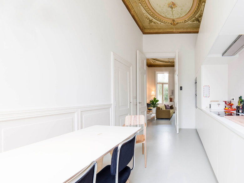 In der Mitte der Baustruktur wird die Treppenanlage durch neue Bäder ergänzt und als struktureller Eingriff lesbar gemacht. Pro Geschoss werden damit je ein Zimmer gegen die Gracht und ein Zimmer gegen den Garten freigespielt, welche über die vorhandenen, grosszügigen Fenster der Aussenfassade belichtet werden. Durch Schiebetüren lassen sich die Zimmer bei Bedarf räumlich abschliessen; bei offenem Zustand kann die ganze Tiefe des Gebäudes wahrgenommen werden und das Licht dringt bis tief in das Gebäudeinnere. Damit entstehen trotz den eher engen Verhältnissen eine räumliche Grosszügigkeit und eine helle, lichtdurchflutete Innenraumatmosphäre.
