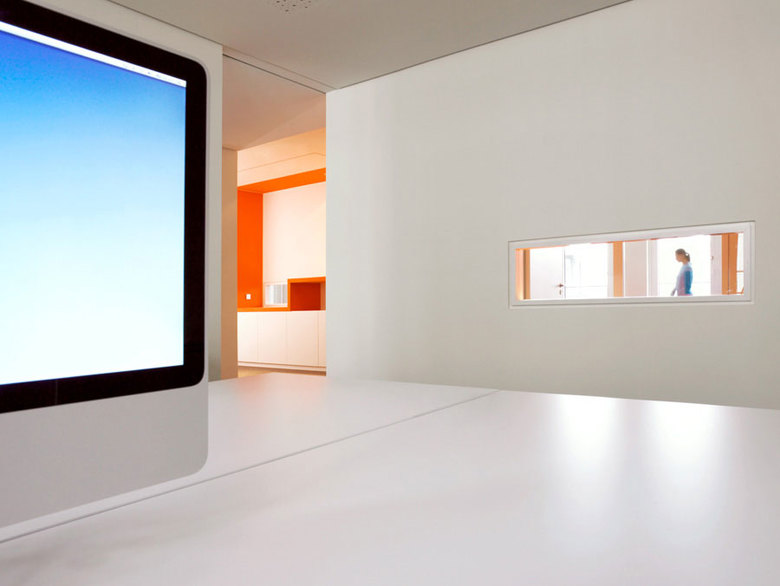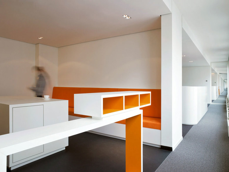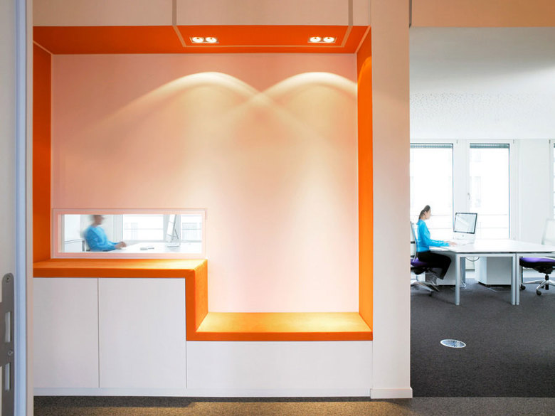 Die Mittelzone ist als Funktions- und Kommunikationsfläche gestaltet und bietet neben Platz für Kopierer und andere gemeinsam genutzte Geräte auch farbig gepolsterte Sitznischen. Zahlreiche Festglaselemente in den Flurwänden ermöglichen dezente Sichtbezüge in die verschiedenen Räumlichkeiten. So entstehen zum Teil sehr weite Durchblicke und Lichteinfälle und die Räume weiten sich quer zum Flur immer wieder auf.