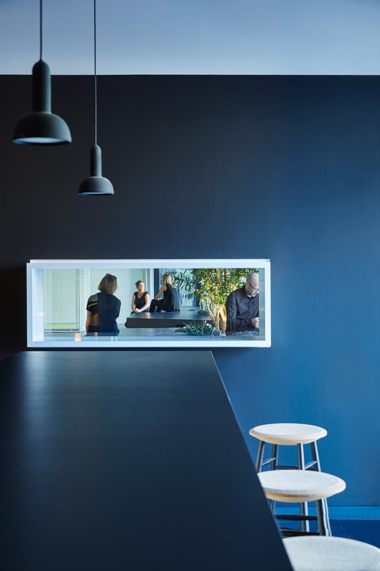 Eine frei im Raum stehende Rückwand verbirgt einen Stauraum für die mobile Bühne und Möblierung sowie eine voll ausgestattete Prototypen-Werkstatt mit Platz zum Arbeiten für zwei Personen. Sie kann ebenso als Projektionswand genutzt und bei Bedarf durch bodenlange Vorhänge verdeckt werden.