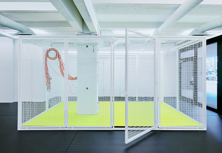 Weiteres fest stehendes Möbel im Raum ist die nach dem Vorbild von Gitterbehältern aus der Produktionslogistik entworfene „Toolbox“. Diese weiße, eigens für das Shuttle angefertigte Gitterbox mit neongrüner Bodenbeschichtung dient der Aufbewahrung technischer Devices.