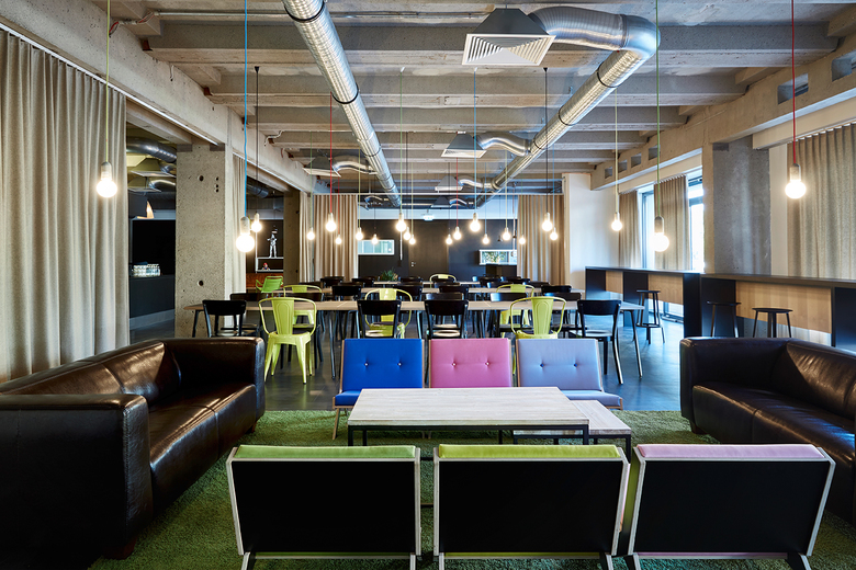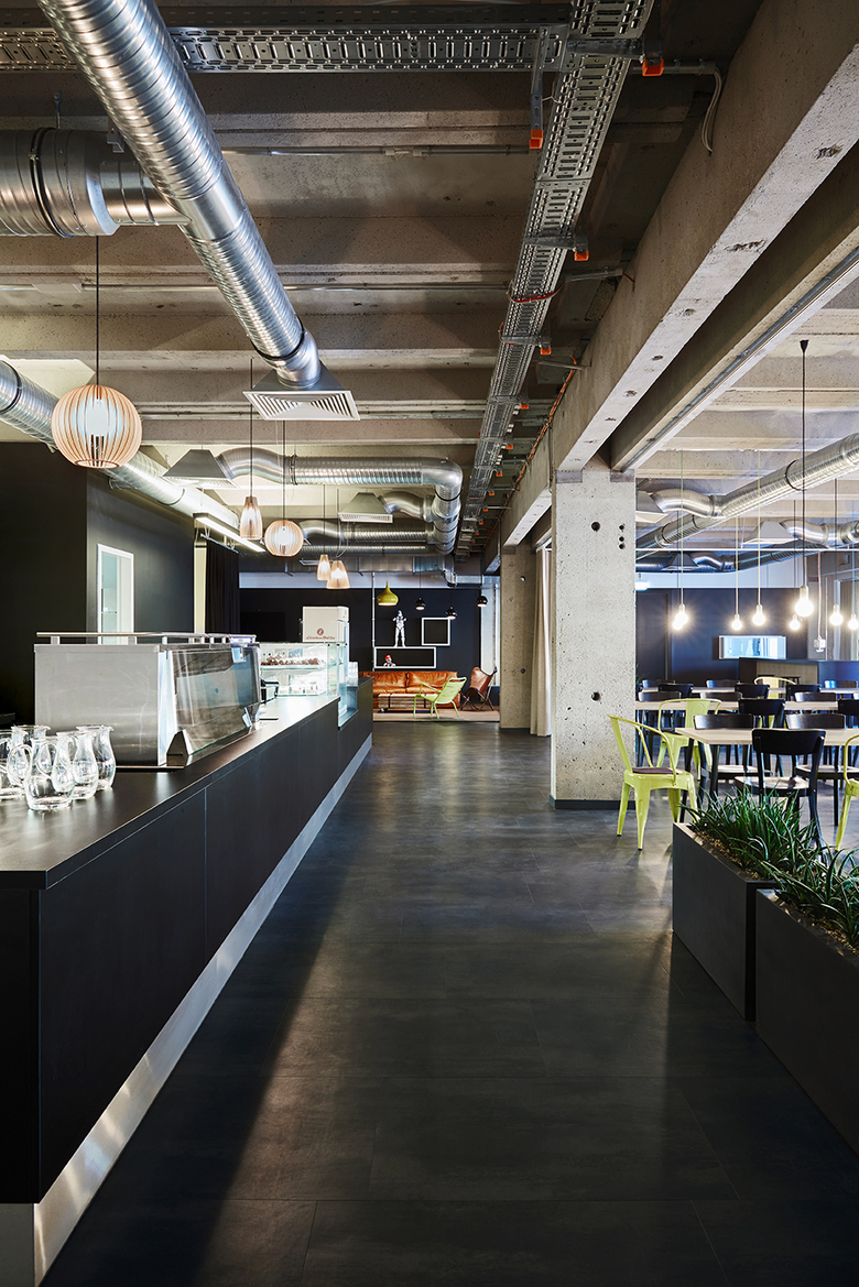 Der direkt ans Shuttle angebundene Food Court steht den Mitarbeitern des Unternehmens als Cafeteria und Aufenthaltsraum zur Verfügung. Der Essbereich kann durch blickdichte Vorhänge räumlich abgetrennt werden. Ergänzt wird das Raumkonzept des Food Court durch die straßenseitige Coffee-Bar, eine Games Zone mit Video-Ecke und Billardtisch, Sofa-Bereiche im Lounge-Style und informelle Meetingzonen. Kleine Fenster erlauben vereinzelte Durchblicke ins benachbarte Innovation Lab.