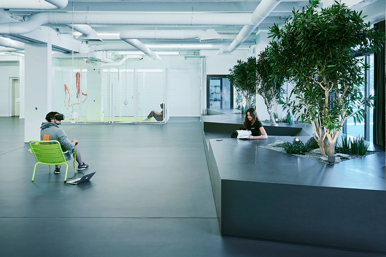 Diese maßangefertigte, elf Meter lange Sitzlandschaft mit Bäumen und Bodenbepflanzung bietet die Möglichkeit zum Relaxen und für Gespräche in grüner Umgebung. Als eine Art Landschaftsrelief konzipiert, dient sie zugleich als Filter zwischen öffentlichem Raum und Innenraum und schützt vor direkten Einblicken der Passanten.