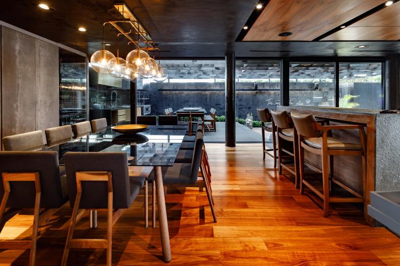 Los espacios en planta baja se diferencian por el cambio de plafón y el uso de los materiales en muebles y muros. En el área de acceso, el plafón totalmente blanco, marca el eje rector de la casa, y tiene como complemento principal un mue-ble integrado a la circulación que te recibe y te da la bienveni-da. Como contraste, en el área de la estancia, el plafón es de madera brindándole así mayor calidez al espacio. Estancia y comedor se encuentran separados por un desnivel y una barra semi flotada brindándole así mayor jerarquía al comedor. El desnivel continúa hasta el área de la terraza, separando a su vez el comedor exterior y el lounge.