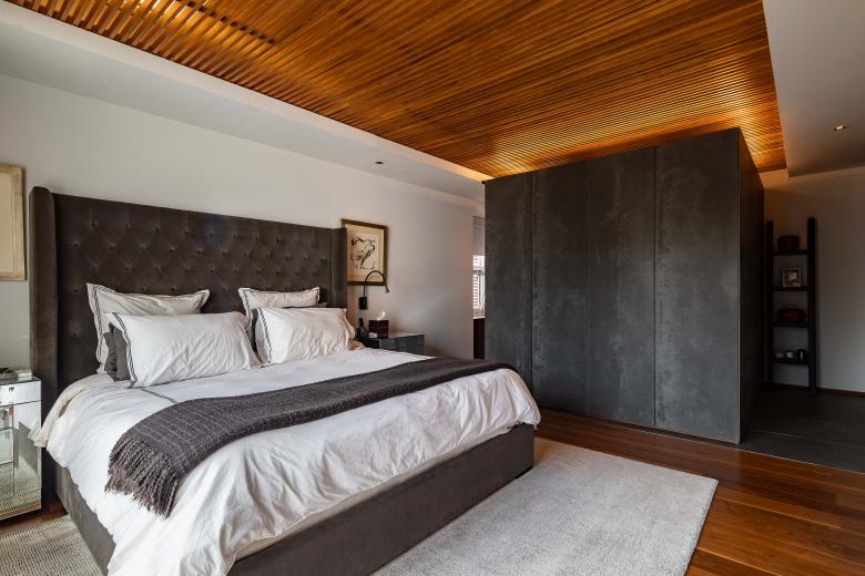 En planta alta, una luminaria colgante enmarcada por un pla-fón flotado como remate visual, cuya función es brindar som-bra y regular la temperatura del family room. En las recámaras secundarias, muros con colores neutros complementaron los muebles de madera de nogal y viroc. En cambio, para la re-cámara principal, se diseñó un plafón de madera tipo marim-ba, cuya ligereza contrasta con los tableros de viroc que confi-nan al vestidor, y permiten generar el acceso tanto a la recá-mara como al baño de la misma.