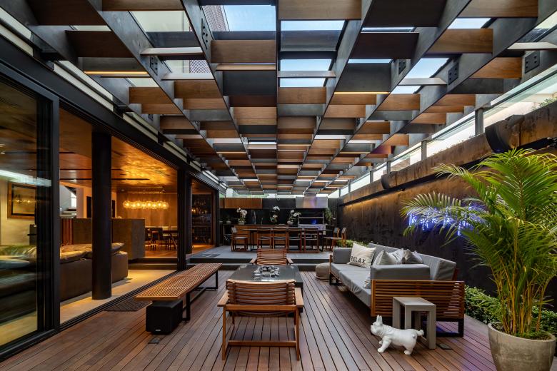 El área de jardín se aprovechó para generar una terraza cubier-ta que integra la estancia y comedor con el exterior. La cubier-ta a base de vigas de acero y vidrio se diseñó con parasoles de viroc que logran un juego con iluminación natural y artifi-cial. Parasoles de madera de nogal semi inclinados fueron dispuestos entre las horizontales de viroc para crear un patrón aparentemente desordenado que protegiera a la terraza de la incidencia solar.