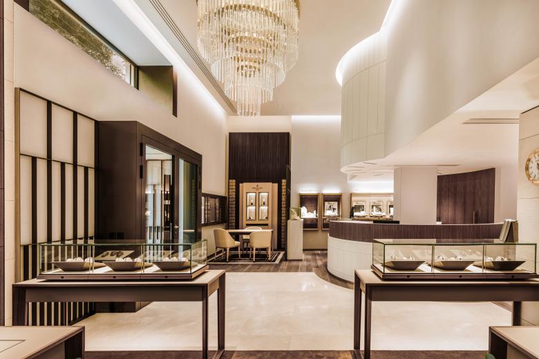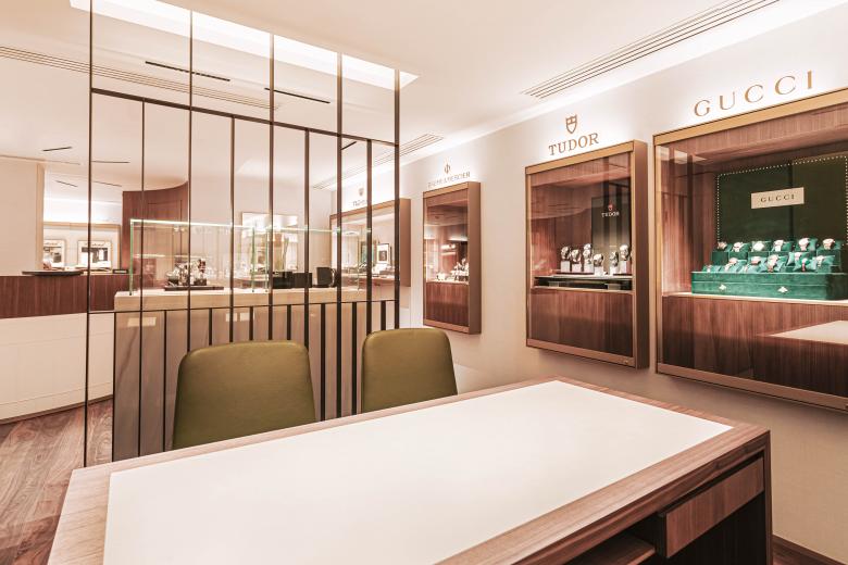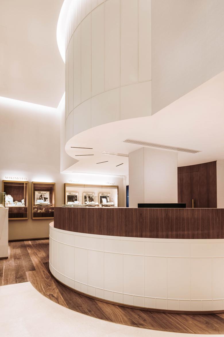 Die 105 Quadratmeter grosse Verkaufsfläche im Erdgeschoss gewann im Zuge der Umgestaltung massiv an Höhe und dadurch an Leichtigkeit. Die Steigerung der Raumhöhe von drei auf knapp sechs Meter war dank eines ungenutzten Hohlraums im Deckenbereich möglich. Im zweiten Stock, der vor dem Umbau als Lagerfläche diente, finden sich neu ein Backoffice, ein VIP-Raum und eine Kitchenette für die Boutique-Mitarbeiter:innen.
