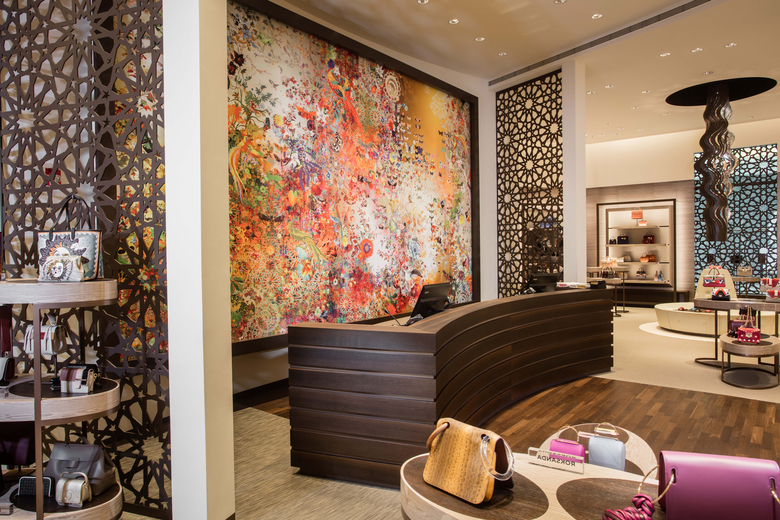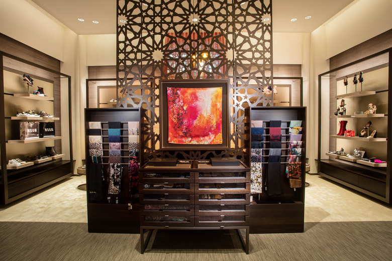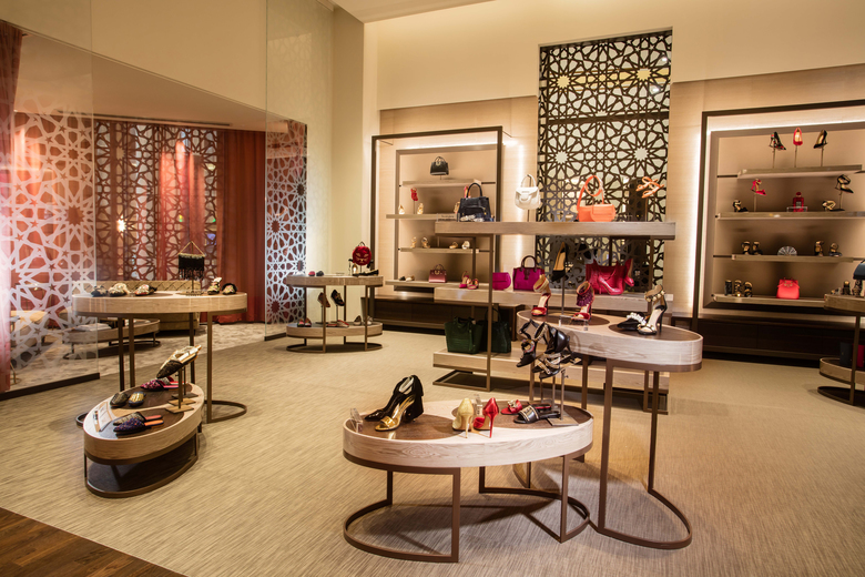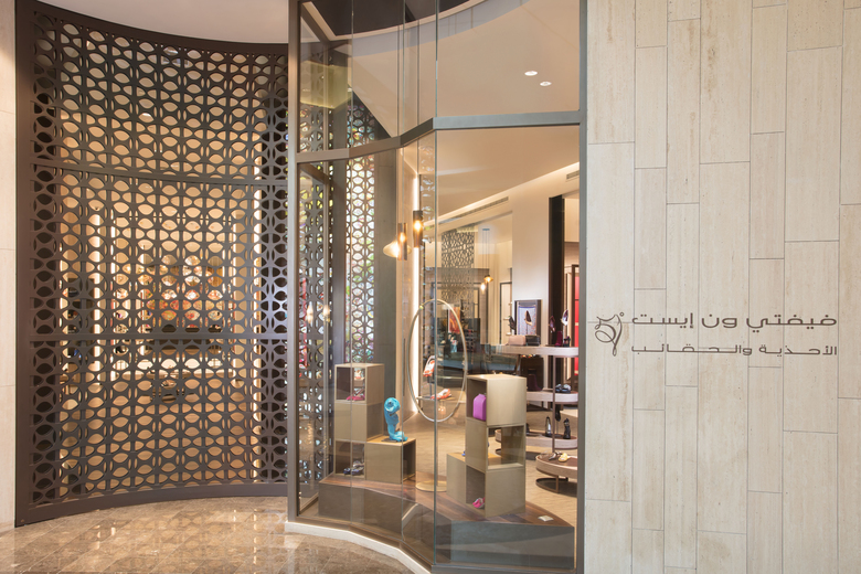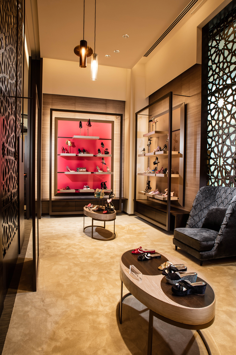 Die Herausforderung des grosszügigen Grundrisses mit zahlreichen Säulen und beeindruckender Deckenhöhe meisterten wir durch eine geschickte Segmentierung. Jeder Bereich der Verkaufsfläche ist auf eine Taschen- oder Schuh-Marke zugeschnitten und lädt zum Entdecken ein. Das Layout garantiert ausserdem ausreichend Privatsphäre, unter anderem dank arabesker Dekor-Elemente mit Referenz zur Region.
