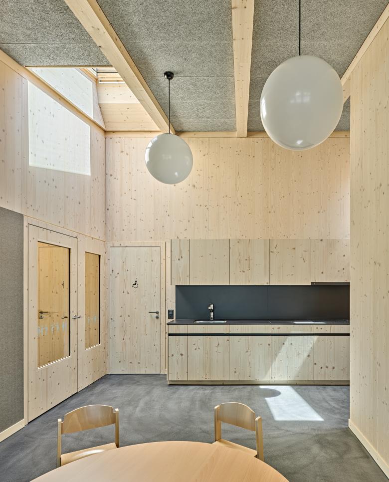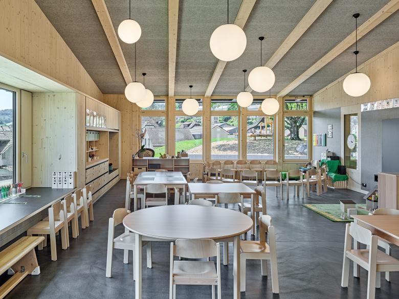 Der neue rechteckige Doppelkindergarten wird mit respektvollem Abstand zu den bestehenden Ulmen auf der Hügelkuppe am Nordrand der Parzelle positioniert. Durch den Rücksprung der Hauptfassade wird ein geschützter Aufenthaltsbereich im Aussenraum gebildet. Alle Nutzungen werden auf einem Geschoss mittels Raumschichten organisiert. Diese sind auf ei-nem Raster aufgebaut und können flexibel eingeteilt, möbliert und ausgestattet werden. In den mittleren, zurückversetzten Raumschichten sind die allgemeinen Räume und die Nebenräume untergebracht. Die Haupträume profitieren von einer dreiseitigen Belichtung.