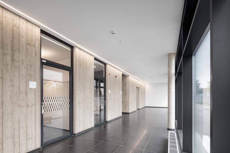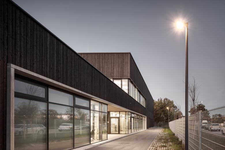 Geprägt von effizienten Funktionen und Abläufen sowie einem kompakten Baukörper, sieht der Entwurf zwei Gebäudeteile vor, die über einen großzügig verglasten Eingangsbereich miteinander verbunden werden.