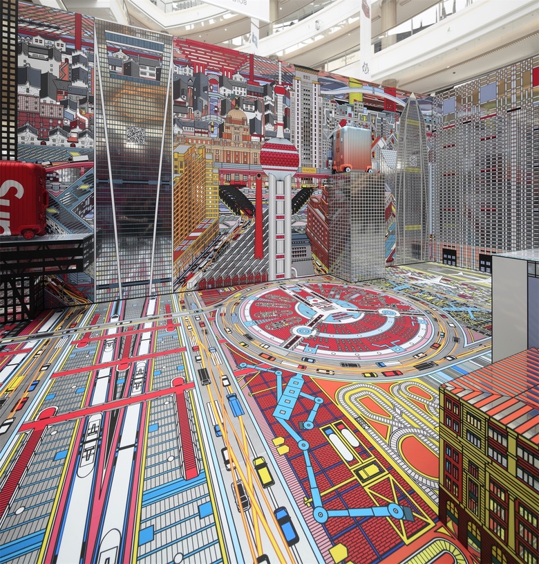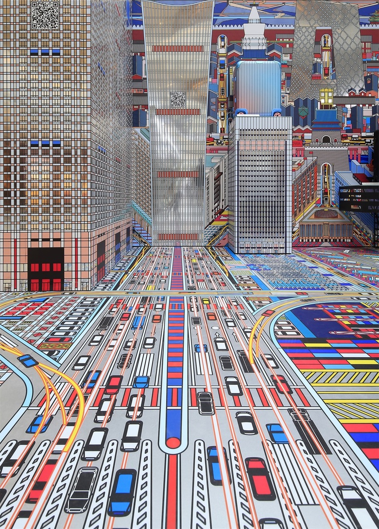 The exhibition is scheduled to tour in Shanghai, Beijing, and Shenzhen. So, the visual content of the installation is a collage in which the landmark architecture and urban scenes from those three cities are represented in one image.