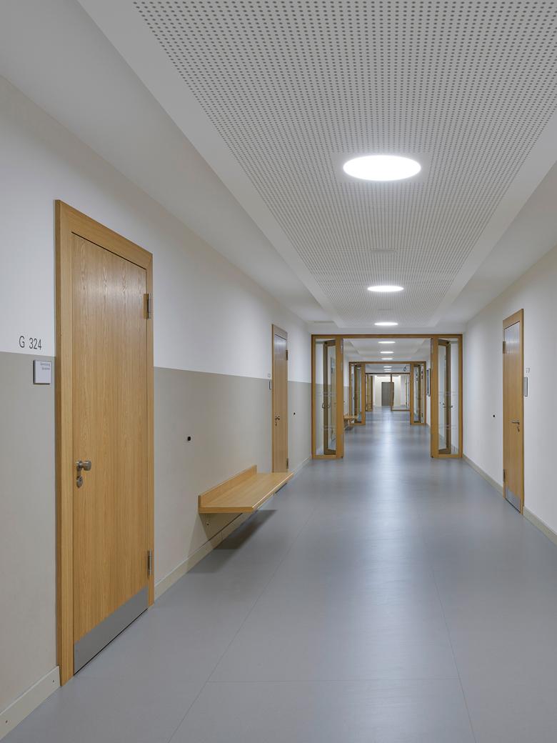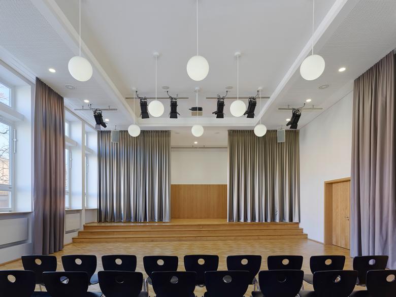 Das Goethe-Gymnasium Ludwigsburg besteht aus drei Gebäudetrakten: Während das 4-geschossige Hauptgebäude aus dem Jahr 1951 auf eine Planung aus der Vorkriegszeit zurückgeht, sieht man dem niedrigeren Zwischentrakt und dem Turnhallengebäude aus den späteren 1950er-Jahren die Nachkriegs-Moderne deutlich an. Das Ensemble steht nicht unter Denkmalschutz, trotzdem sollte bei der Generalsanierung der Charakter der Gebäude erhalten bleiben. Beim massiven Hauptgebäude mit seinen Naturstein-Elementen wurde auf einen Vollwärmeschutz verzichtet, jedoch Dach und Fenster erneuert. Der Zwischentrakt erhielt eine Fassadendämmung, mit Betonfertigteilen auf der Nordfassade vor den ungedämmten Betonpfeilern; der Turnhallenbau bleibt vorerst unsaniert. Im Innern der bisherigen Bauabschnitte wurden die komplette Haustechnik, die Sanitärbereiche und der Innenausbau erneuert. Der Brandschutz und die Raumakustik wurden auf Stand gebracht, sowie Einzelbereiche behutsam umstrukturiert. Ein konsequentes Materialkonzept mit Holzelementen in Eiche erzeugt eine zeitgemäße, helle Lernumgebung.