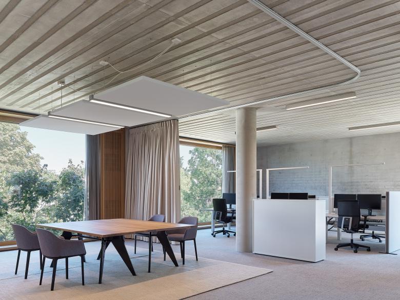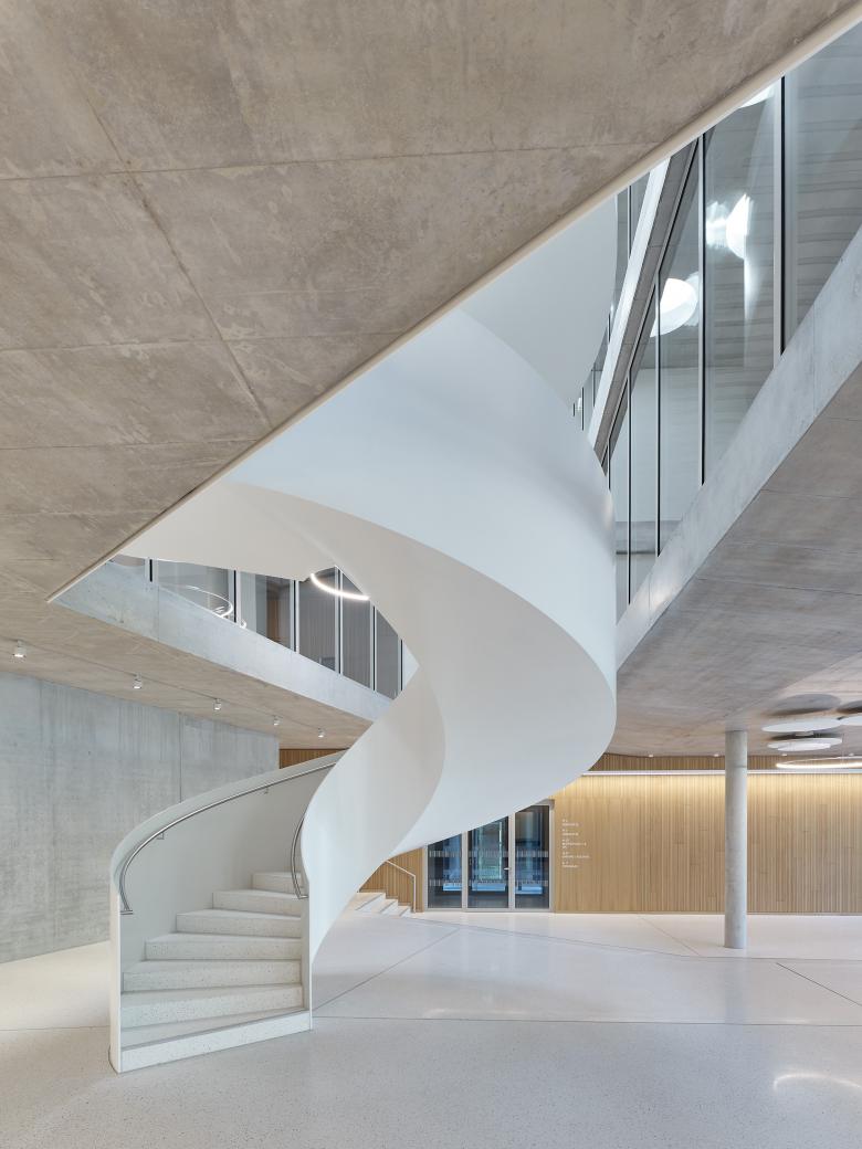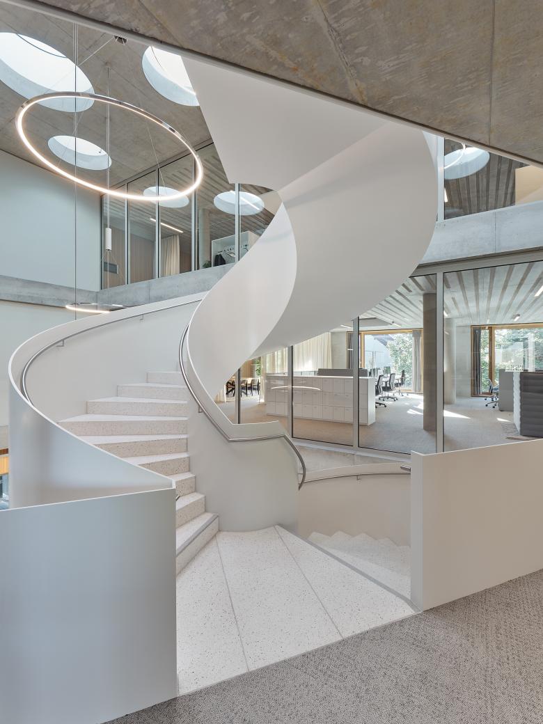Der neue Hauptsitz des Steinbeis-Verbundes ist ein Erweiterungsbau einer von unserem Büro bereits 2000 fertiggestellten Privathochschule. Der Neubau mit seiner unregelmäßigen Grundfläche nutzt das dreieckige Baufeld maximal aus. In den Obergeschossen wird die Fassade durch großzügige Fensterelemente in nur einer Größe rhythmisiert, während im Erdgeschoss bodentiefe Fassadenbänder auf die hier anzutreffenden Sondernutzungen reagieren und das Foyer optisch auf voller Breite zum Außenraum öffnen. Im Inneren gliedert ein unregelmäßiges, von oben belichtetes Atrium die Büroflächen der Obergeschosse in vier kleinere Einheiten und dient zudem mit seiner eingestellten Wendeltreppe als vertikale Haupterschließung des Hauses. Über die großzügigen Fensterelemente der Außenfassaden und die verglasten Innenfassaden zum zentralen Atrium entstanden gut belichtete, transparente und übersichtliche Büroflächen, die sowohl individuelle Arbeitsplätze als auch Kommunikations- und Rückzugsorte ausbilden.