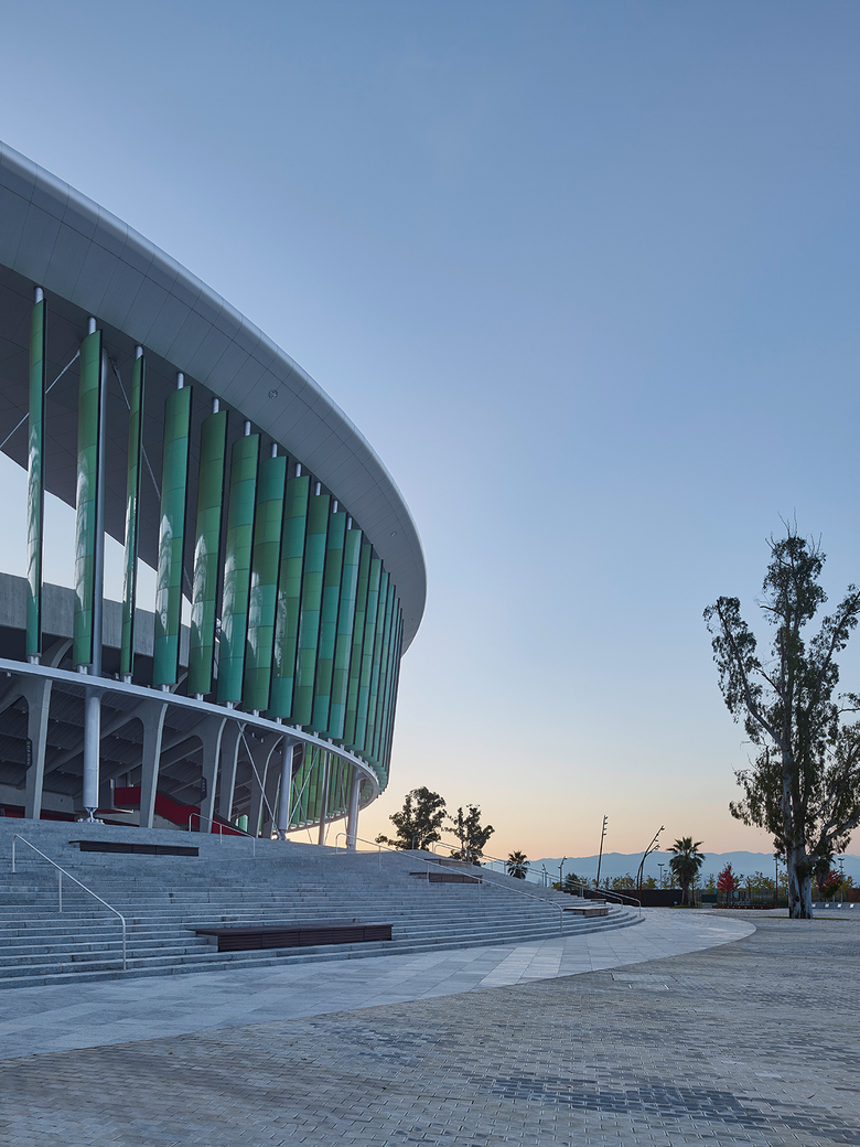 An der georgischen Schwarzmeerküste entstand eine Open-Air Konzertarena mit einer Kapazität von ca. 9.000 Besuchern, die einen gewissen Schutz vor Wind, Sonne und Regen für den Zuschauerbereich bieten sollte. Ansteigende, halbkreisförmig angeordneten Sitzränge des offenen Auditoriums richten sich wie in einem antiken Theater auf die große Bühne aus. Darunter sind Besucherfoyers, VIP-Bereiche, 4 Kinos sowie Neben- und Technikräume angeordnet. Bühnenseitig bietet ein U-förmiges, sechsgeschossiges Gebäude Platz für ein Zwischenlager, eine Cafeteria, Umkleiden und die Büros der Verwaltung. Durch eine gemeinsame Dachkonstruktion aus Stahl und umlaufende transluzente und hinterleuchtbare Lamellen werden Auditorium und Bühnengebäude zu einer weithin sichtbaren Großform zusammengefasst. Die Dachfläche über dem Zuschauerbereich lässt sich öffnen und alle Lamellen sind drehbar, wodurch sich die Black Sea Arena an unterschiedliche Witterungen und Situationen anpassen kann. Je nach Bedarf kann sie in ihrer Umgebung ruhig und zurückhaltend bleiben, oder sich für Veranstaltungen einladend öffnen und die Besucher willkommen heißen. Zusätzliche technische Nebenfunktionen wie eine große Lagerhalle, eine Feuerwache, eine autarke Energiezentrale und eine Wasseraufbereitung wurden in einem separaten Nebengebäude zusammengefasst. Die komplette Freianlagenplanung mit Masterplan, Erschließung und Infrastruktur für das Gebiet war Teil der Gesamtaufgabe.