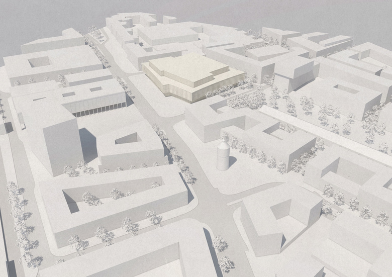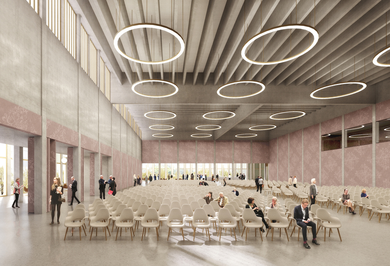 Einem Puzzlestück gleich fügt sich das neue Konferenzzentrum ergänzend und klärend in die stadträumliche Situation ein. Durch gezielte Modulation verzahnt sich der Baukörper mit dem städtebaulichen Kontext und ordnet die Platzfolge Bahnhofsplatz Süd und Zollhofgarten neu. Zum südlichen Bahnhofsplatz hin präsentiert sich das neue Konferenzzentrum einladend und offen. Durch einen markanten Rücksprung in der Gebäudekubatur wird ein repräsentativer Vorplatz vor dem Haupteingang geschaffen, der dank seiner klaren städtebaulichen Fassung den Bahnhofplatz über die Straße hinweg erweitert. Nach Westen hin bildet das Konferenzzentrum einen klaren Abschluss des Grünraumes Zollhofgarten. Aus drei horizontal geschichteten, filigran geformten Polygonen entwickelt sich ein schwingender Baukörper, der dem neuen Konferenzzentrum sein elegantes Erscheinungsbild verleiht. Vor dem Haupteingang wird durch den Rücksprung ein repräsentativer, überdachter Vorplatz geschaffen, der in Richtung Zollhofgarten mit gastronomischem Angebot zum Flanieren und Verweilen einlädt.