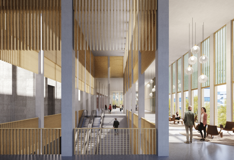 Über dem Sockelbereich im Erdgeschoss erhebt sich das Piano Nobile mit den Sälen und den umlaufenden Foyerbereichen, von denen aus sich dem Besucher weite Ausblicke zum Bahnhof und über den Zollhofgarten bieten.