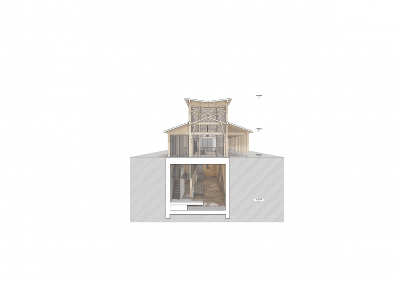 In Analogie einer überdachten Ausgrabungsstätte präsentiert sich der Ausstellungspavillon auf dem neu gestalteten Hopfenmarkt. Er überspannt den „Einschnitt“ in die Unterwelt, wo die Grundmauern Hamburgs erster Siedlung freigelegt werden und künftig zu besichtigen sind. Seine Ausrichtung orientiert sich am Verlauf der unterirdischen Wallanlage und weicht damit den „oberirdischen“ Richtungen des Hopfenmarktes und der Kirchenruine mit einem leichten Dreh aus. Gleichzeitig stellt der Pavillon eine Reminiszenz an die Markthallen des Hopfenmarktes dar, die lange Zeit an diesem Ort standen. Das minimalistische Raumprogramm aus Eingangsbereich mit Kasse und kleiner Cafébar sowie den zugehörigen Nebennutzungen ist in einer Halle aus Licht untergebracht, die in den Abendstunden wie eine Laterne diesen besonderen Ort erleuchtet. Zwei spiegelsymetrisch angeordnete Treppen führen den Besucher hinunter in die Ausstellung und geleitet ihn am Ende des Rundgangs wieder hinauf ins Foyer und zur neu gestalteten Parkanlage. Eine Pavillonarchitektur in Holzbauweise: eine typische Konstruktionsmethode temporärer Bauten, Holz ein traditioneller und archaischer Baustoff. Der Neubau spielt mit dem Faktor Zeit, möchte auf die Flüchtigkeit der Geschichte, auf die Überlagerung verschiedener historischer Schichten an diesem Ort verweisen und erlangt dadurch seine ganz eigene Identität als Pendant zur steinernen Ruine der Nikolaikirche.