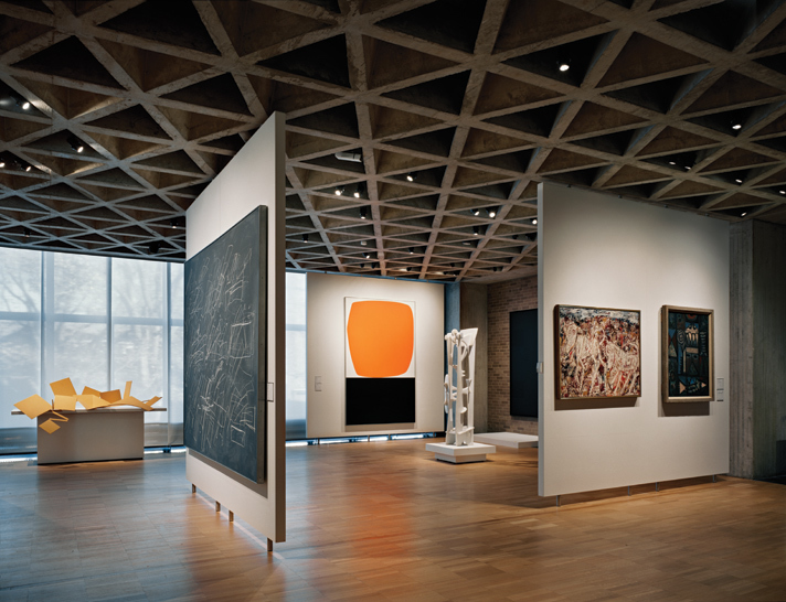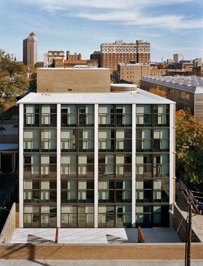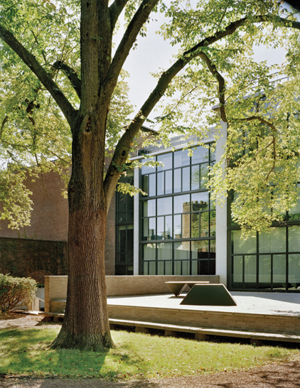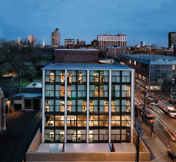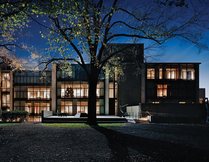 The renovation of the 1953 Louis Kahn Art Gallery building restores many features of the original design and upgrades outmoded systems, including the complete replacement of the building’s original window-wall system, most dramatically along the west and north facades. The new system duplicates the appearance and profiles of the original while addressing the original wall’s technical shortcomings and accommodating the strict temperature and humidity requirements of a modern museum. The renovation restores an open exterior courtyard that was roofed over in the 1970’s. With the removal of partitions, the galleries now reveal spacious, unobstructed vistas according to Kahn’s original vision. Other highlights include the refurbishment of the tetrahedral ceilings, designed to house the electrical and ventilation systems; the transformation of the first-floor lobby into a media lounge, an inviting information center and gathering place; and a complete upgrade of building systems.