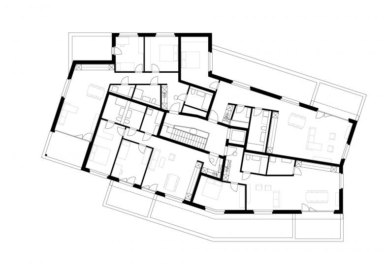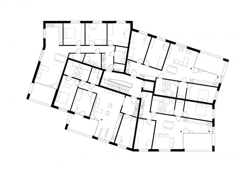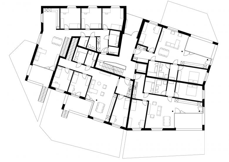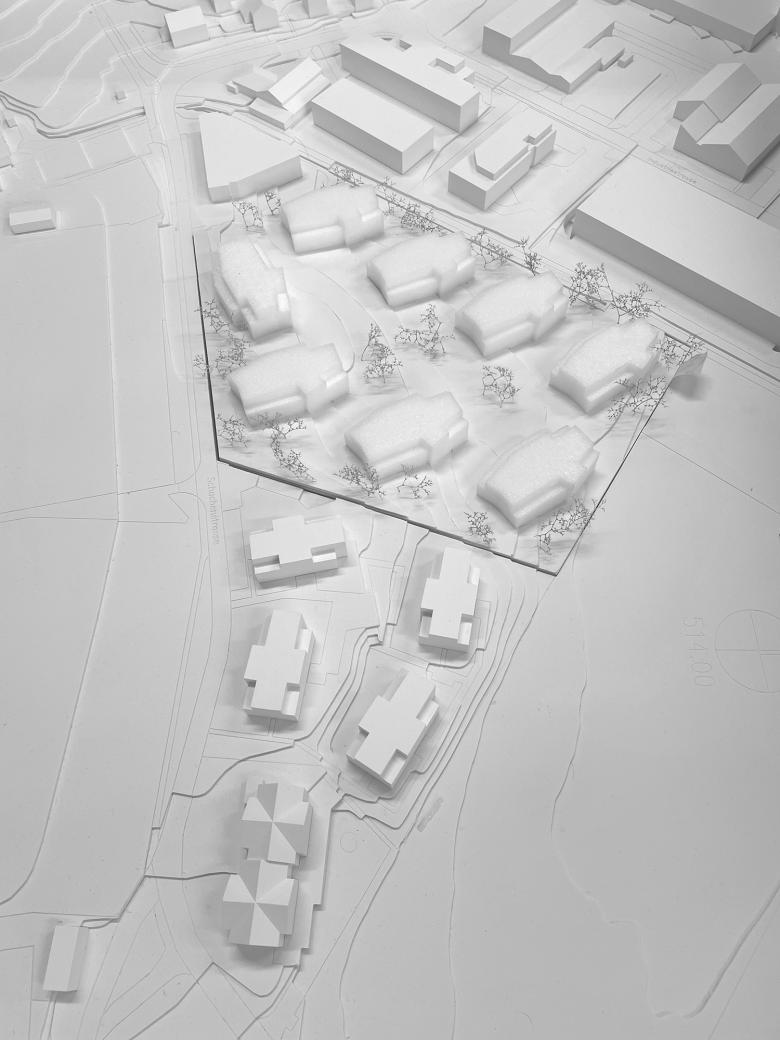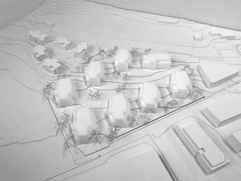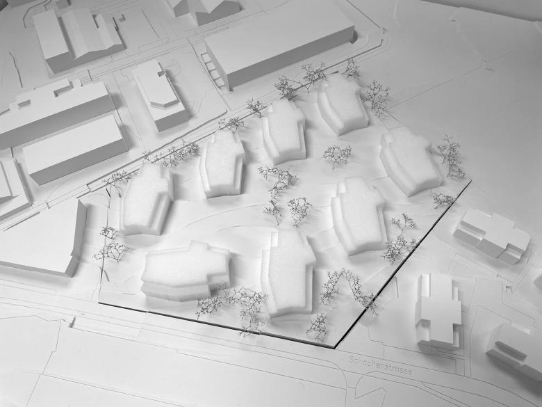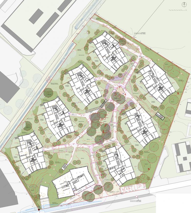 Da wenig Strassenanstoss zur Verfügung steht ist es für eine funktionierende Adressbildung wichtig, eine identitätsstiftende Mitte auszubilden, von der aus die einzelnen Häuser erschlossen werden. Eine offene Bebauungsstruktur schafft fliessende Übergänge zu den bewohnten Nachbargrundstücken, der Landschaft und dem attraktiven Bachlauf. Die vier westlich angeordneten Baukörper folgen der Bachlinie und sind, um u.a. den Arealzuschnitt optimal auszunutzen, in ihrer Stellung zueinander leicht aufgespreizt. Neben einer regelmässigen Gebäudeanordnung und einer klaren Strukturierung der z.T. darunter liegenden Einstellhalle, resultieren spannungsvolle und abwechslungsreiche Zwischenräume. Die Fassadenabstände sind angemessen, die Aussichten aus den Wohnungen durch die leichten Baukörperabdrehungen optimiert. Die Hauszugänge liegen auf der Erdgeschossebene an der Nordostseite, so dass die privaten Aussenbereiche und die Wohnräume möglichst nicht tangiert werden. Die drei östlich angeordneten Bauten sind analog orientiert, verfügen durch die schräg verlaufende Grundstücksgrenze aber über eine grössere Verschiebung zueinander. Die Hauszugänge liegen hier im Untergeschoss, so dass das Erdgeschoss analog dem Obergeschoss ausgebildet werden kann. Der achte Baukörper an der Strasse hat eine vermittelnde Funktion. Dank der Gewerbenutzung im Erdgeschoss ist die Lage an der Strasse ideal und bildet mit dem angrenzenden Gebäude, das zur Hälfte über eine Gewerbenutzung verfügt, einen einladenden Auftakt in die Siedlung. Je Geschoss sind vier Wohnungen so angeordnet, dass die Wohnräume nach SüdOsten, Süden, Süd-Westen oder Westen orientiert sind.