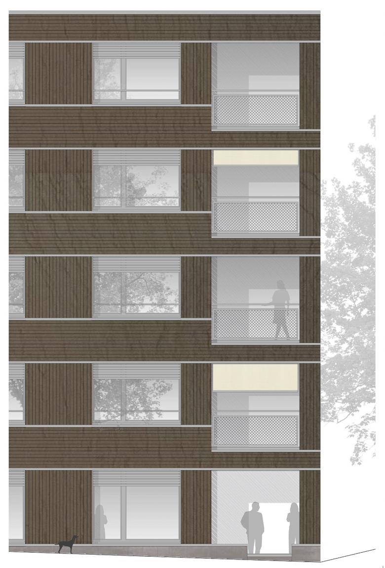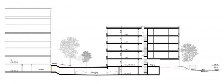 Das Mehrfamilienhaus an der Hardstrasse ergänzt auf der noch freien Fläche die beiden 2012 - 2018 erstellten Ersatzneubauten. Innerhalb des ortsbaulichen Gesamtkonzeptes wird der Neubau in die Siedlungsstruktur eingefügt. Der neue fünfgeschossige Baukörper übernimmt die Ausrichtung und Höhen der Nachbarbauten und unterscheidet sich bewusst von den beiden turmartigen Solitärbauten an der Kapellstrasse.