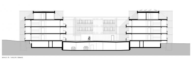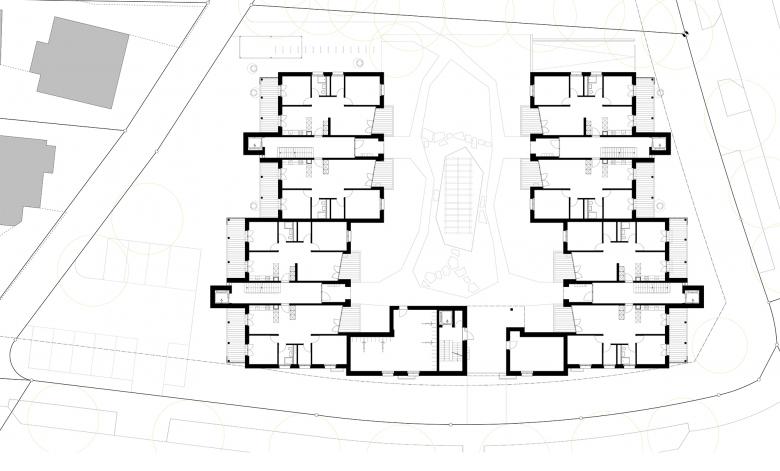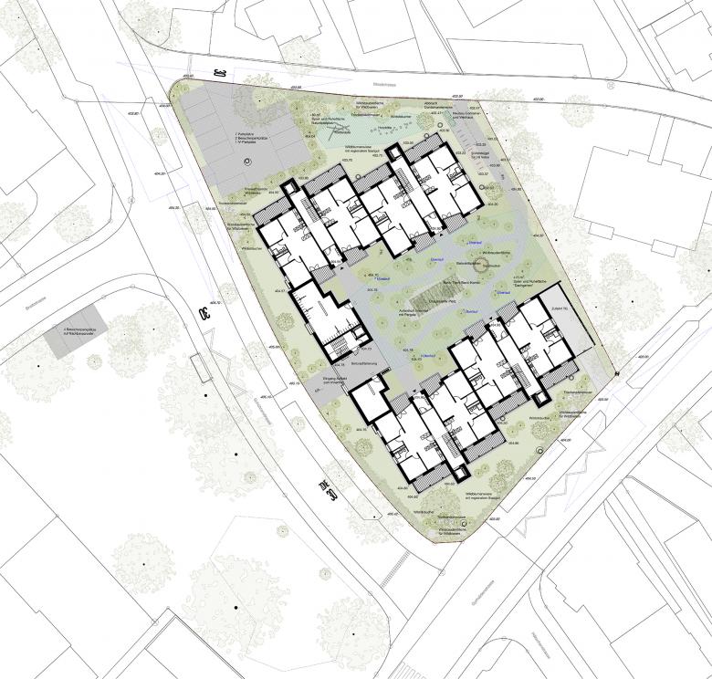 Die Bauherrschaft beabsichtigt mit einer Sanierung und Nachverdichtung die Liegenschaft energetisch, behindertengerecht sowie im Komfort zu verbessern. Die Satteldächer mit den darunterliegenden unattraktiven Dachwohnungen werden abgebrochen und durch ein Attikageschoss in Holzbauweise mit grosszügigen Dachterrassen ersetzt. Weiter werden die zweiläufigen Treppenhäuser durch eine einläufige Treppe ersetzt und mit einem Lift ergänzt. Die kleinen Balkone zum Innenhof bleiben bestehen. Die Aussenbereiche werden durch grosse, fassadenbildende Balkone auf der Gebäudeaussenseite erweitert. Die bestehende Aussendämmung wird durch einen neuen Fassadenaufbau mit einer hinterlüfteten Holzfassade energetisch verbessert und aufgewertet. Ein Zwischenbau mit vier neuen Kleinwohnungen ergänzt die Gesamtanlage und stellt den rollstuhlgängigen Zugang in die Tiefgarage sicher. Ein attraktiver Aufenthaltsbereich mit Pergola mit einer neuen Begrünung und Wegnetz werten den Innenhof auf. Die Individualbereiche im EG werden auf die Balkongrösse beschränkt, wodurch der Innenhof grosszügiger erscheint. Die Aussenbereiche erfahren eine naturnahe, mit ergänzenden Elementen für Insekten, vorgesehene Umgestaltung.