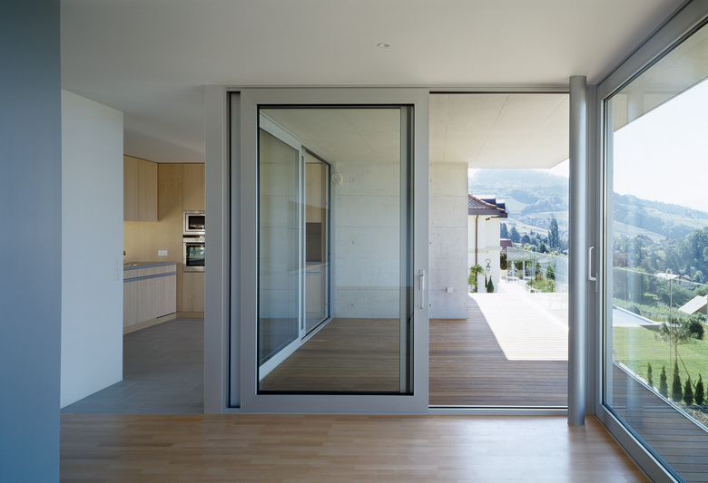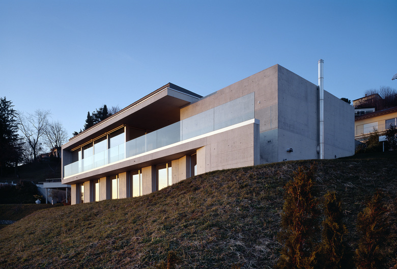 La villa s’implante dans un terrain en forte pente. L’accès à la maison se fait de plain pied depuis le haut de la parcelle et permet d’accéder à la zone jour, qui se prolonge largement par un balcon filant et une vaste loggia ouverte sur le paysage lémanique. Les chambres se situent à l’étage inférieur, au niveau du terrain naturel. Les services (buanderie, caves, locaux sanitaires) se regroupent dans la partie excavée de la maison. L’emplacement judicieux de l’escalier permet d’éclairer naturellement le couloir de distribution des chambres. La composition générale de la maison résulte du décalage issu de la juxtaposition en plan et en volume du garage avec son couvert d’entrée par rapport à la surface englobant la cuisine et l’espace du séjour/coin à manger. La modestie de l’intervention et les moyens mis en œuvre ont permis de réduire de manière conséquente le coût de construction de cet ouvrage.