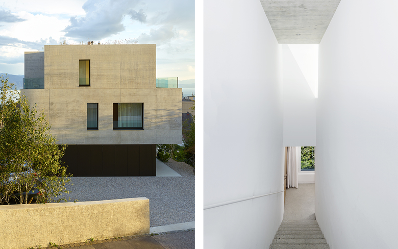 Inséré dans un tissu urbain hétéroclite, le nouveau bâtiment en béton brut apparent se présente comme un monolithe minéral surgissant de la végétation, dans lequel sont creusées des terrasses, des loggias et des couverts. La parcelle en forte déclivité s’ouvre en direction du sud et offre de beaux dégagements vers le lac et les montagnes. Une cage d’escalier éclairée en façade distribue trois appartements de surfaces similaires: 2 appartements sur un niveau et 1 appartement d’attique en duplex. Les appartements s’organisent de manière fluide en réduisant les espaces de circulation au profit des espaces de vie. La cuisine et le séjour s’articulent autour d’une grande loggia ou d’une terrasse ouverte au sud et à la vue. Chaque appartement bénéficie de trois ou quatre orientations. Les murs extérieurs en béton sont porteurs. Les fenêtres sont conçues comme de grandes ouvertures sur le paysage et le contexte bâti environnant. Elles se décomposent en deux parties: un volet plein pour la ventilation et une partie vitrée pour la vue et la lumière. Le jardin paysagé est constitué de terrasses qui s’étagent dans la pente, parfois minérales, parfois végétales, créant des ambiances spécifiques qui en agrémentent l’usage.