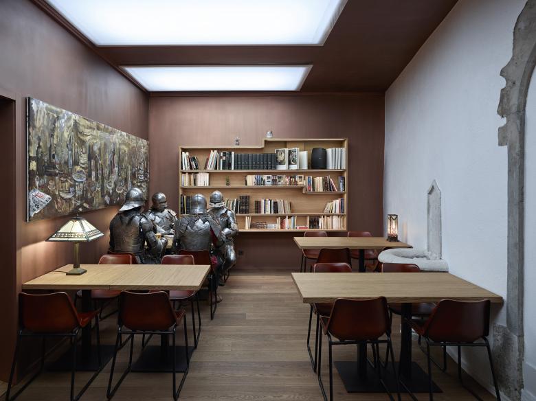 Sur l'arrière, une seconde salle se dévoile, plus intime. Ce qu'on pourrait appeler un stamm. Un lieu parfait pour des réunions plus confidentielles. Une même bibliothèque travaillée sur trois hauteurs différentes en orne le mur du fond. La lumière est ici zénithale, naturelle en journée, car cet espace a été gagné en son temps sur une petite cour intérieure. Comme témoignage du préexistant de la Vieille-Ville genevoise, une fontaine murale et des encadrements d'anciennes arches et fenêtres ont été révélés, nettoyés et exposés en l'état. Toujours le mariage des contraires.