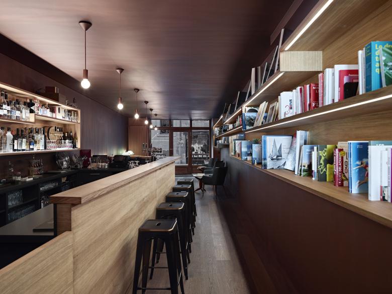 Dans un espace plutôt confiné, étroit par endroits et avec une vitrine ouverte sur la rue, le challenge a été de marier livres et bouteilles. Mixer le patrimoine et la contemporanéité, les histoires littéraires et les brèves de comptoir. Pour ce faire, deux grandes bibliothèques ont été construites sur mesure et en face à face, avec les mêmes proportions, trois hauteurs pensées pour accueillir les différents formats des uns et des autres. Les livres sont éclairés par en haut pour en éclairer la tranche quand les bouteilles le sont par le bas pour en révéler les étiquettes. L'ensemble est en chêne pour plus de cosyttude, comme tous les éléments construits d'ailleurs (parquet, bar, tables). Les murs et le plafond sont, eux, recouverts d'une peinture cuivrée. Un espace lecture rassemble une poignée de fauteuils, une série de tables sert aux joutes oratoires, aux réunions spontanées. Les lampes sont d'inspirations art déco, datées des années 1920, une époque qui a assuré la tradition entre classicisme et modernité. On peut aussi y voir un clin d'œil à l'ouverture de la librairie.