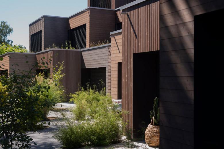 Cedar Housing is like a treehouse inside the city. The project finds strength in its ability to embrace opposites: remote and central, natural and urban, individual and collective, private and shared, dense and quiet, minimal and comfortable. The housing consists of six triplexes lined up, with duplexes on each end. Strong from its context, it follows the circular shape of the site's centenary-old cedar. Its tiered form, dents and offsets allow for various social experiences and dialogue between urban densities. Variations in the cladding modify the perception of scale, revealing the story of an imaginary escape in the woods.