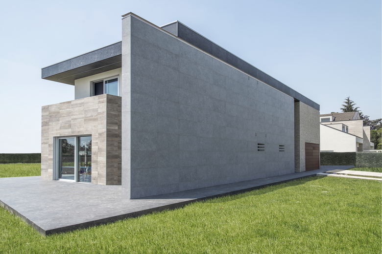 2. boxes - volumes between the two large slabs are functionally and architecturally diversified: the first, clad in stone piasentina, spread over two floors and contains at the ground floor, the garage and the storage room, at the first floor bedroom, bathroom and wardrobe. The second volume, one floor high covered in gres, contains the kitchen. The third, hanging from the roof, has a prismatic shape: it is finished in plaster and contains a bedroom facing south. The connections between the “boxes” are in glass to keep all the elements visible from the outside;