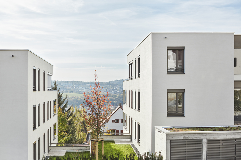 Außenräume – Die Südhanglage, die Aussicht über die Stadt und die durchgrünte Struktur sind ausschlaggebend für die hohe Wohnqualität im Quartier. Mit der Nord-Süd- Ausrichtung der Baukörper wird die Durchlässigkeit in Richtung Tal erhalten und die typische Rhythmisierung und Raumbildung fortgesetzt. Private Freiräume werden unter Nutzung der ausgeprägten Hangneigung als kleine Mietergärten, als Dachterrassen und als eingeschnittene südorientierte Balkone angeboten.